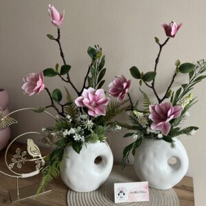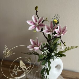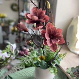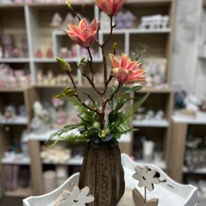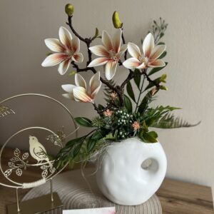 Hazai keramikus által készített, különleges vázába épített csillag magnóliás dekoráció,mely évekig otthonod/irodád dísze lehet.