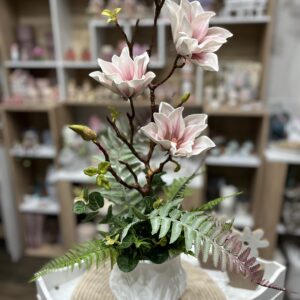 Különleges fehér kerámia vázába épített csillag magnóliás dekoráció.