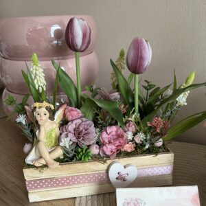 20 cm-es fa dobozba épített tavasztündéres asztali dekoráció,bájos tavasztündérrel,györgyikékkel,élethű tulipánokkal,sok zölddel.
