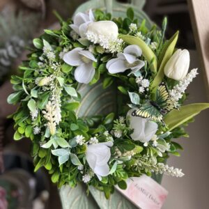 30 cm átmérőjű, élethű zöld alapos finom színvilágú ajtódísz tulipánokkal,magnóliákkal és györgyikékkel, pillangóval.