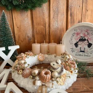 25 cm-es pihe-puha szőrös alapra készített,irtó cuki cukrászegérkés adventi dekoráció, kerámia sütikkel/kekszekkel,cserélhető rusztikus gyertyákkal. Hazai,kézműves termék.