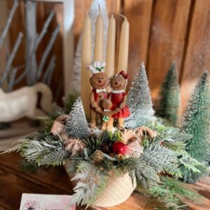 Kerámia tálas adventi dekoráció,melyben egy 3 tagú mézeskalács család a központi elem. Élethű zöldekkel. Hazai,kézműves termék.