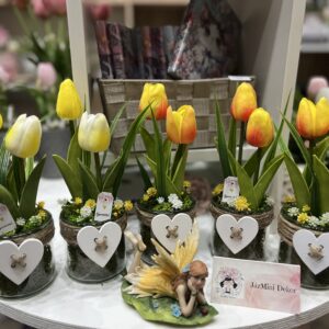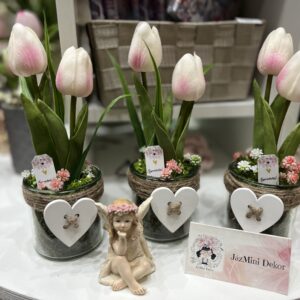 Fa szivecskés üveghengerben színes,csodás élethű tulipánok bármilyen alkalomra ajándékozhatóak vagy akár saját otthonodba,ha vágynál egy kis tavaszra. Hazai,kézműves termék.
