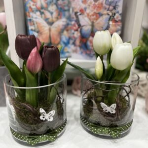 Élethű tulipánok üveghengerben pillangóval-fehér
