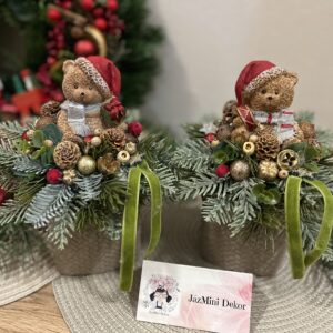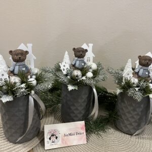 Cuki macikákkal készített asztali dekorációk kerámia kaspóban,fenyővel,házikókkal.