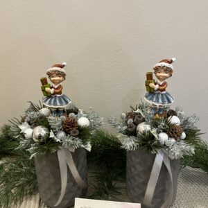Cuki manólányokkal készített asztali dekorációk kerámia kaspóban,élethű fenyővel.