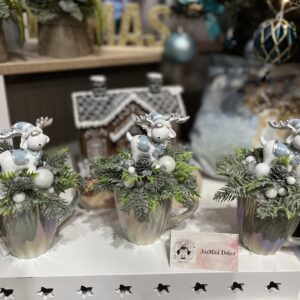 Cuki rénszarvasokkal készített asztali dekorációk, irizáló /fényes porcelán bögrékben, élethű fenyővel.