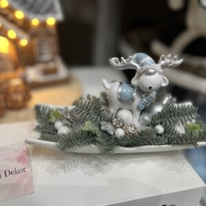 Élethű ezüst fenyővel és egy kedves rénszarvassal készített asztali fekoráció kerámia tálon.