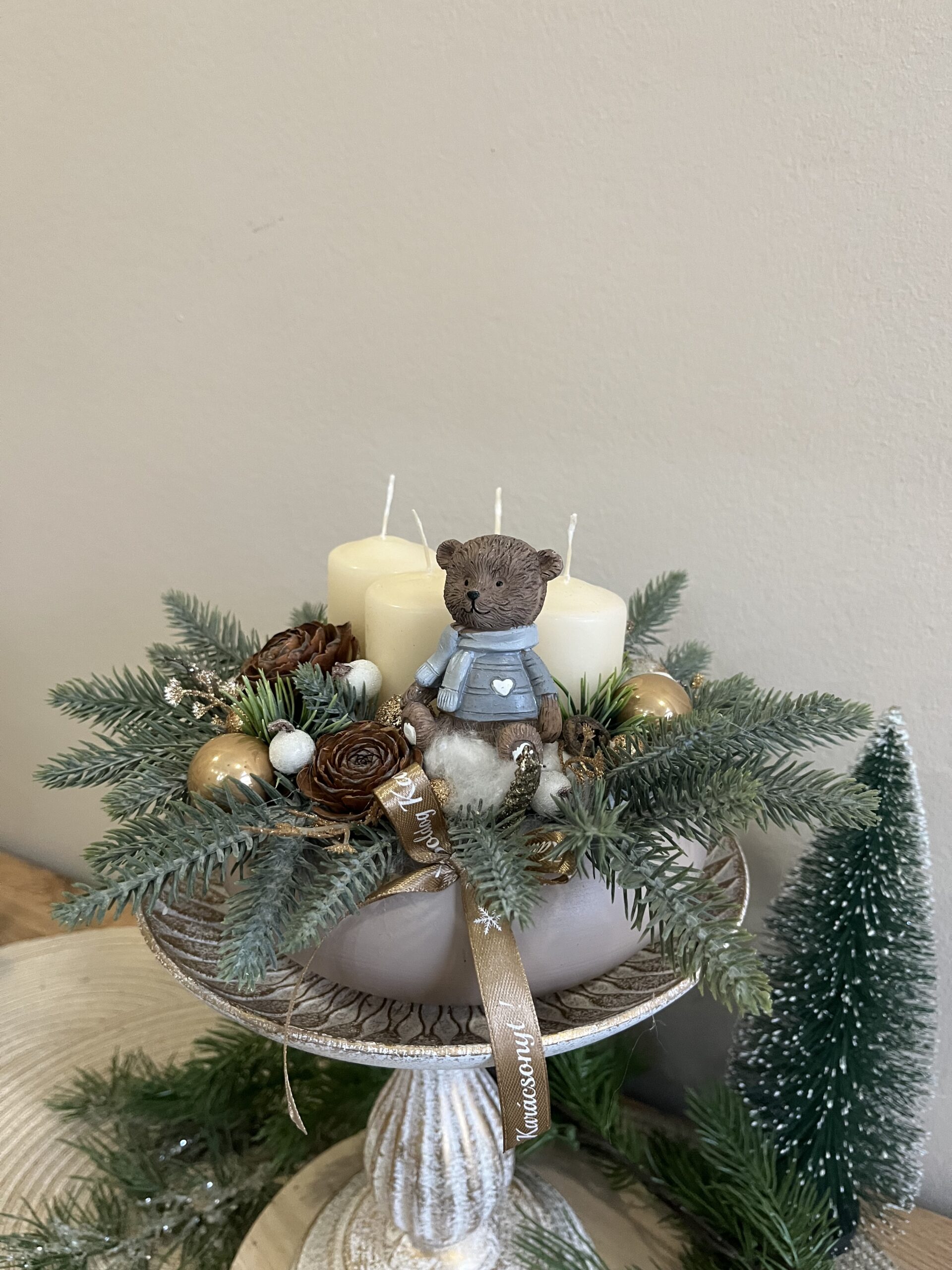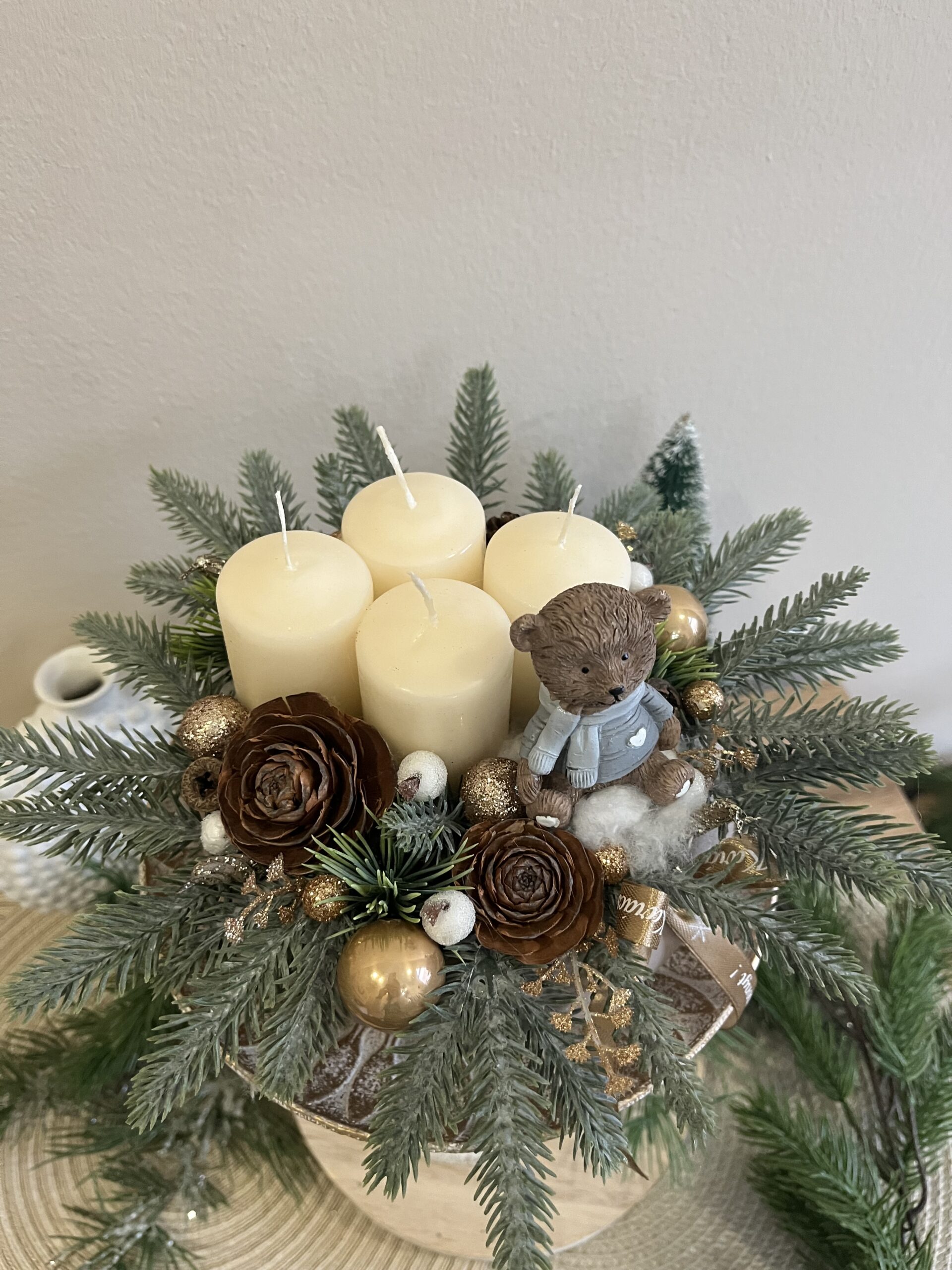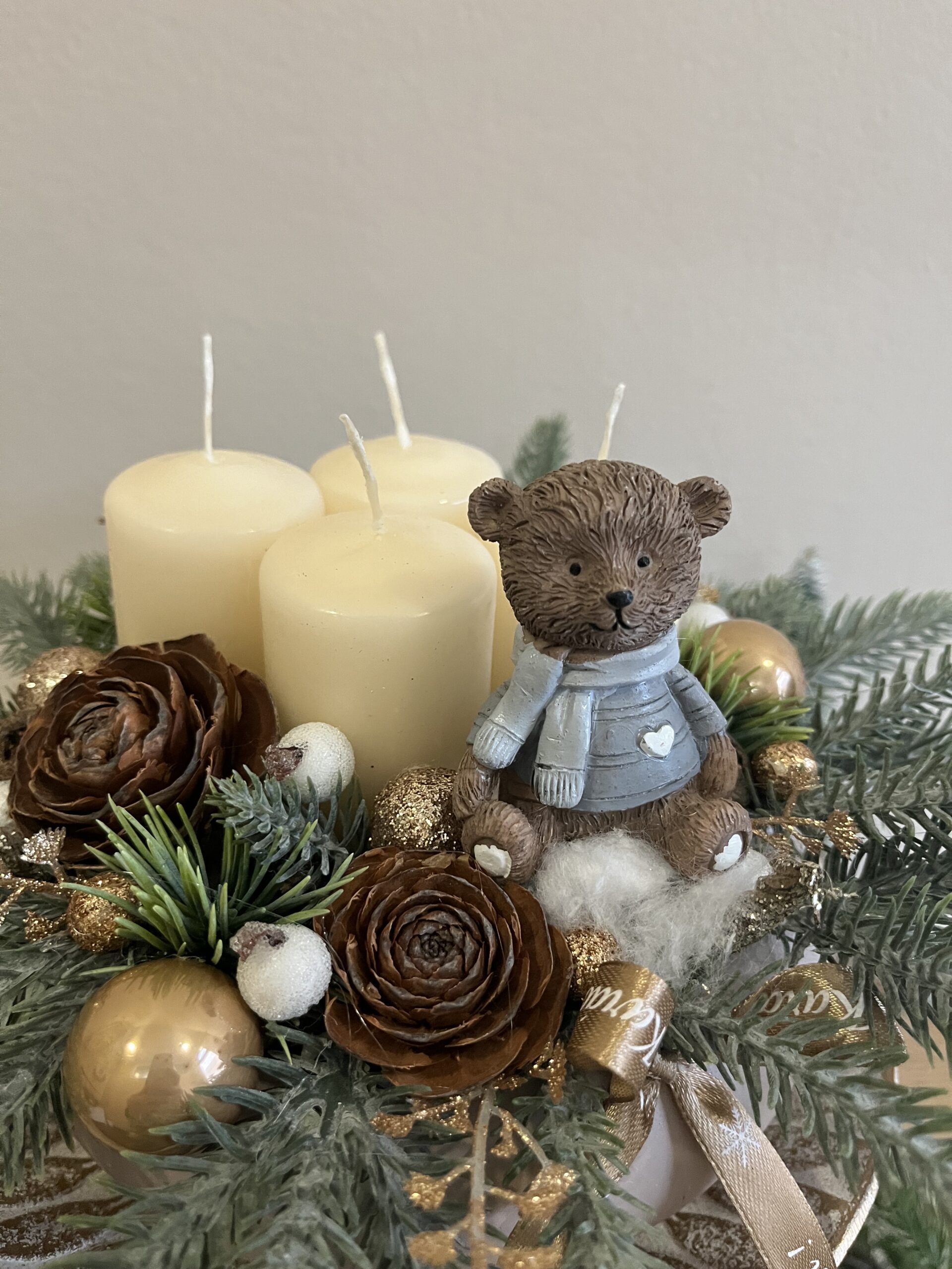 Címkék: adventi koszorú, arany, barna, élethűzöld alap, fenyő, gyertya, karácsony, kerámia tál, krém, maci, tél