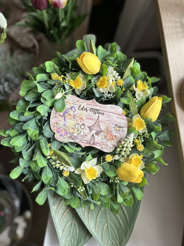 33 cm átmérőjű,élethű zöld alapos kopogtató kedves fa táblával,tulipánokkal, györgyikékkel,nárciszokkal.