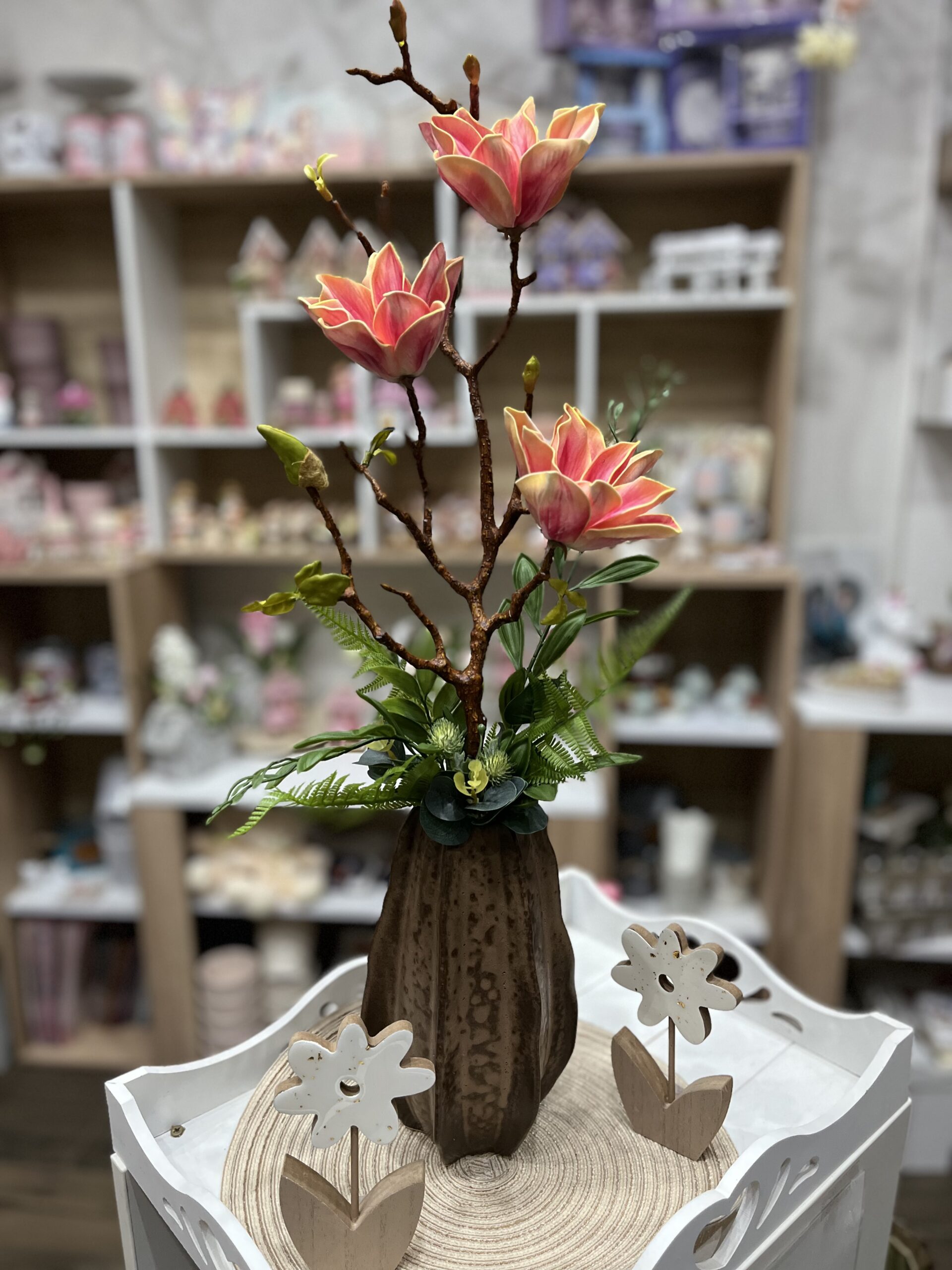 Hazai keramikus által készített, különleges vázába épített csillag magnóliás dekoráció,mely évekig otthonod/irodád dísze lehet.