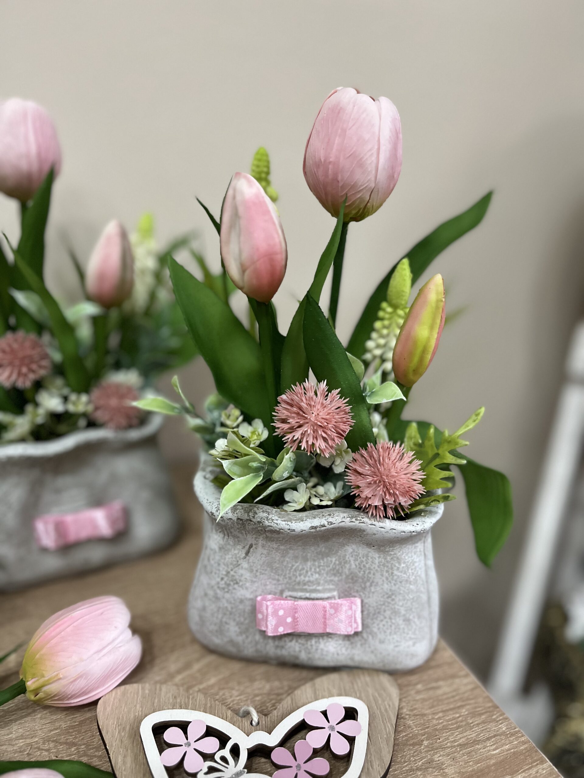 Kő zsákocskába épített,púder színű élethű tulipános dekoráció,mely csodás tavaszváró dekorációja lehet otthonodnak/irodádnak.