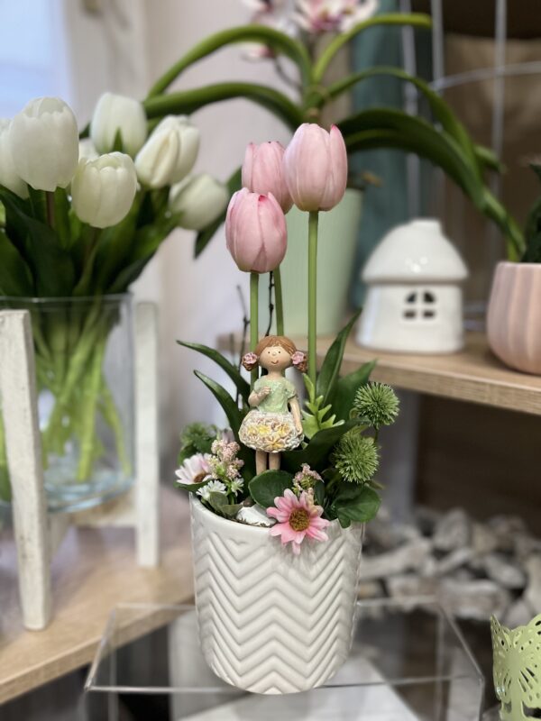 35 cm magas,bordás kerámia kaspóba épített tavaszváró kedvesség egy bájos kislánnyal s hosszú szárú,élethű tulipánokkal.