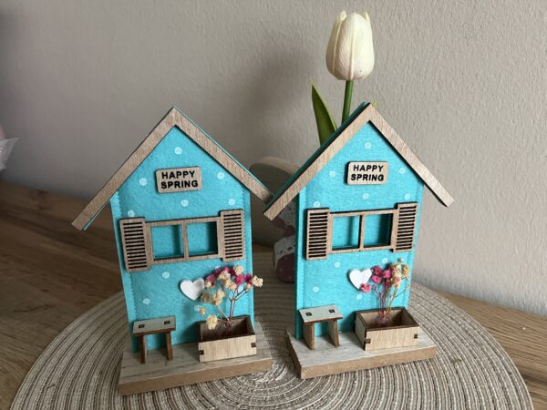 16*12 cm-es, 4 cm mély fa/filc tavaszi házikós dekoráció.