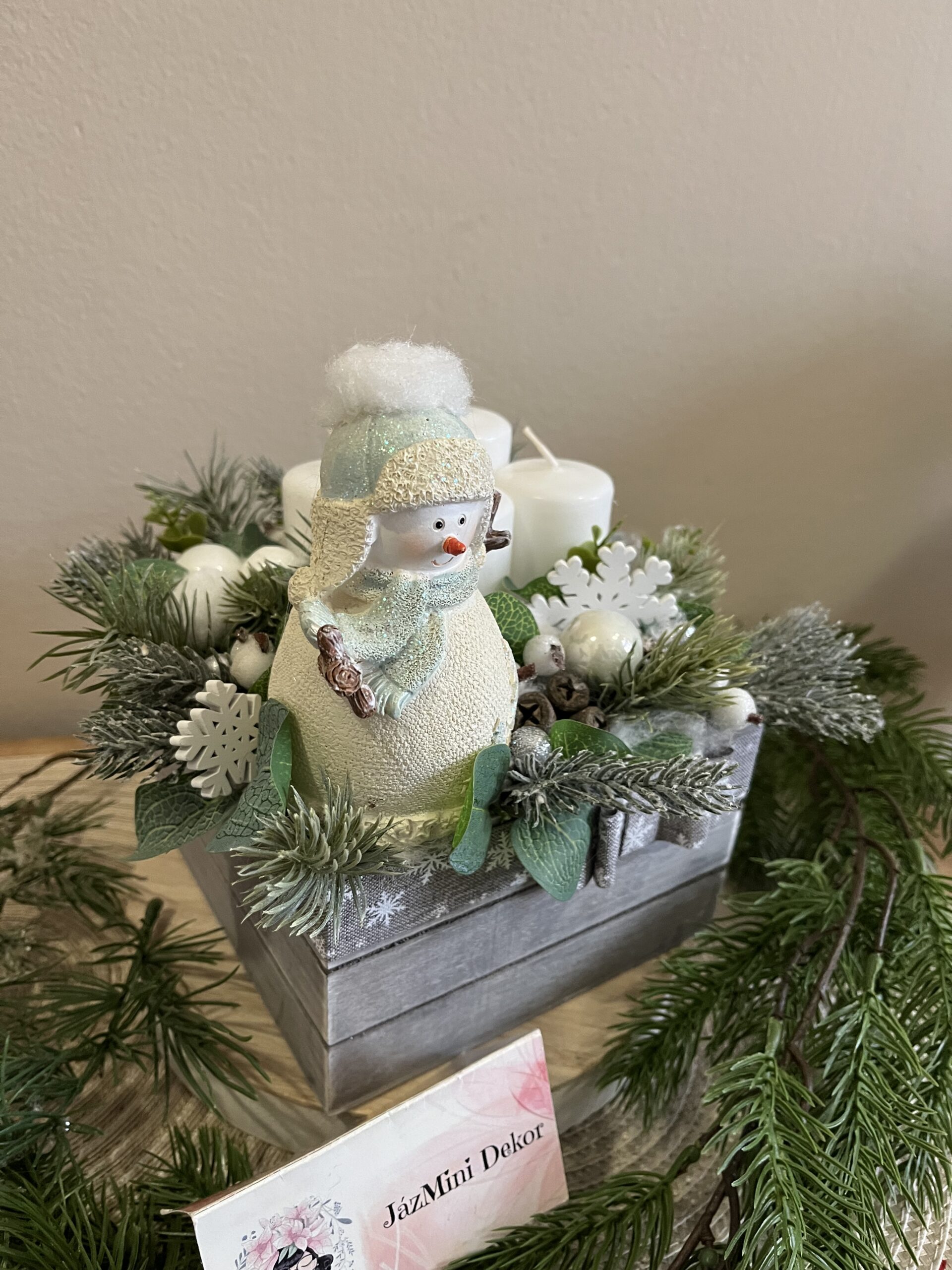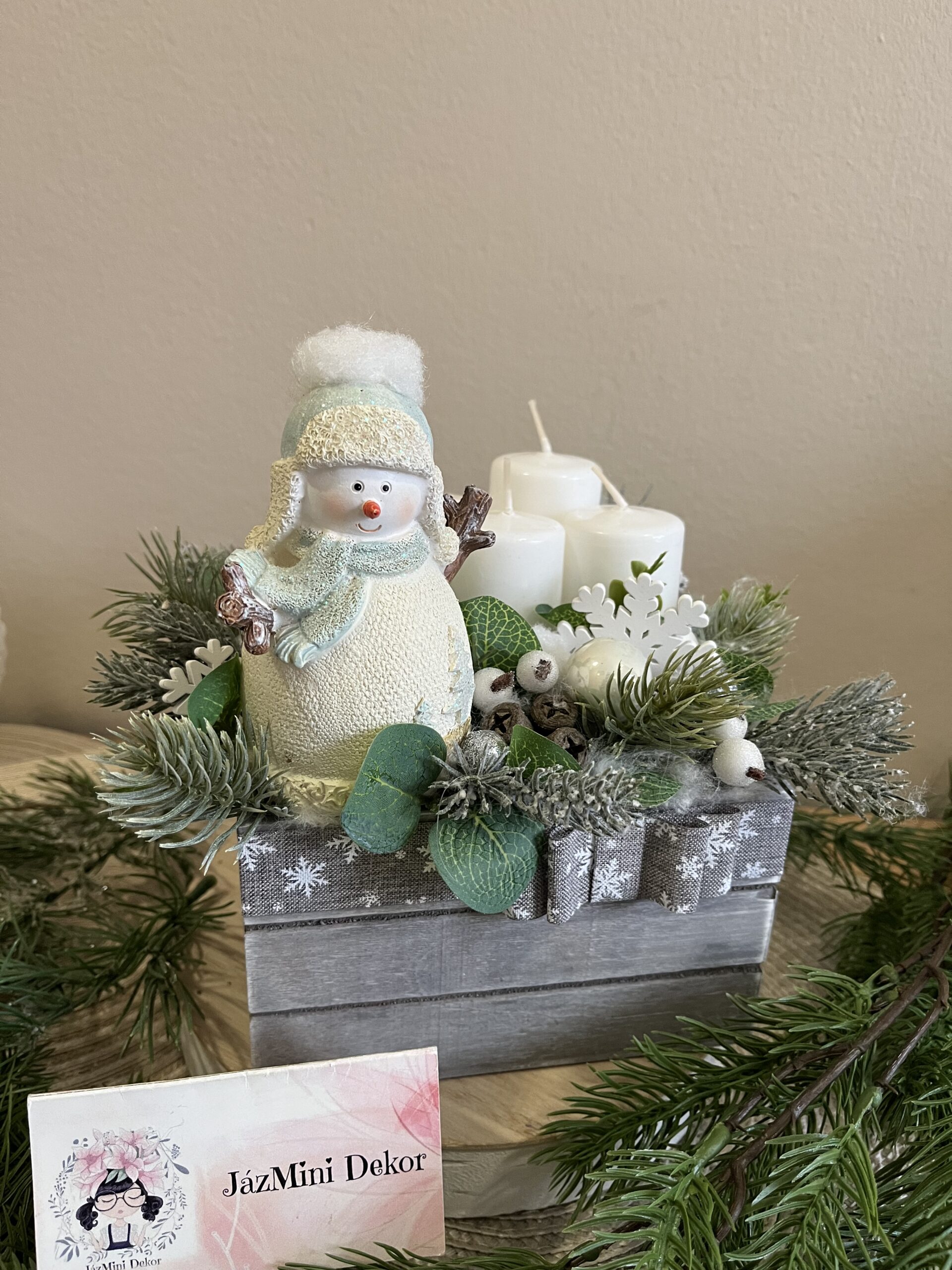 Élethű fenyővel készített hóemberes fadoboz cserélhető gyertyákkal.