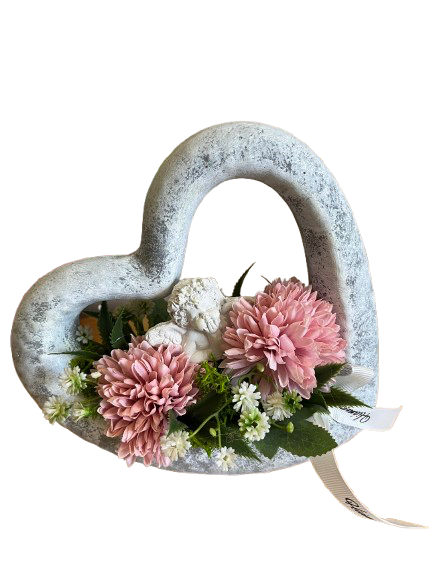 Kerámia álló szív angyalkával-szürke/mályvás rózsaszín