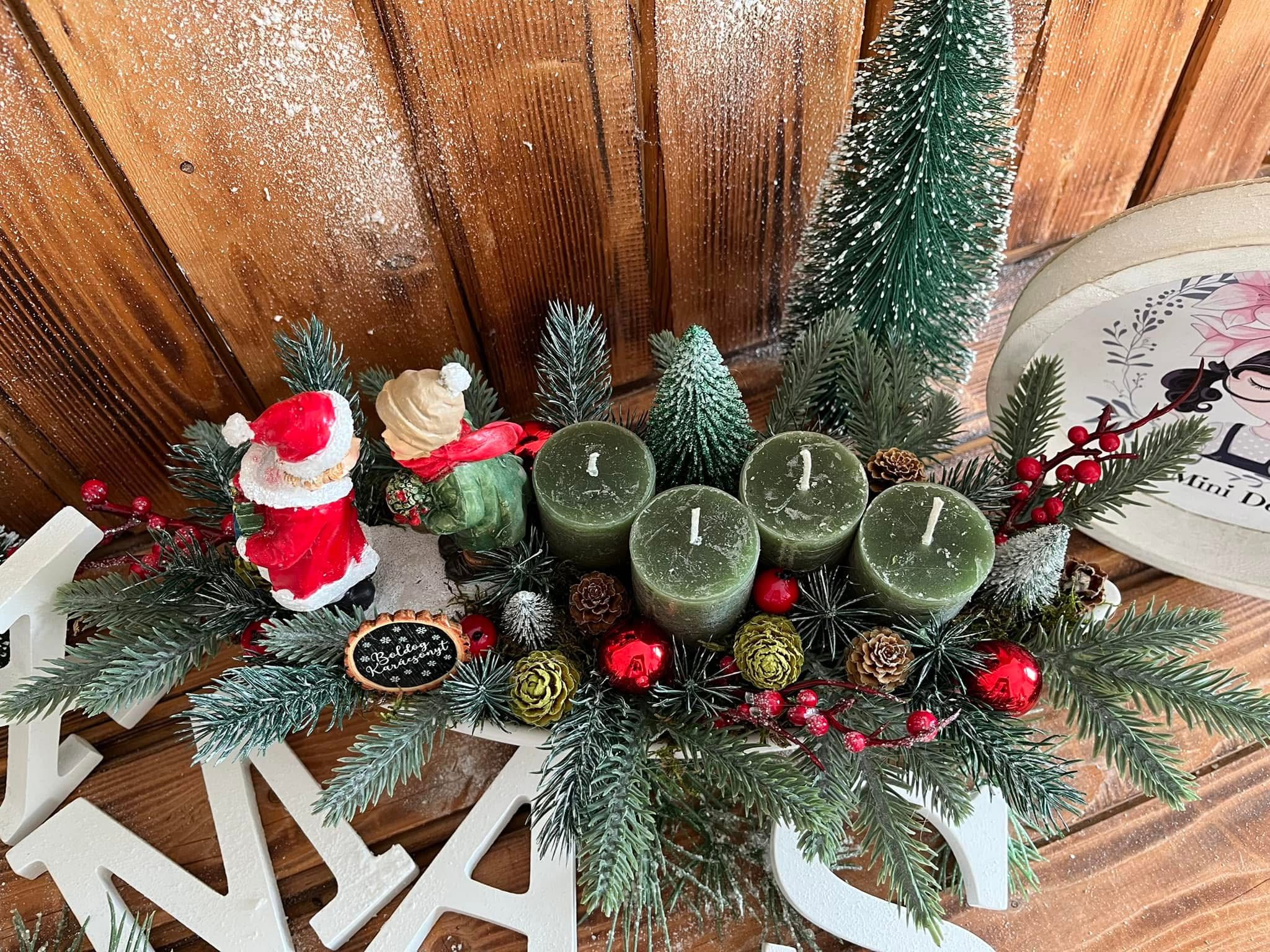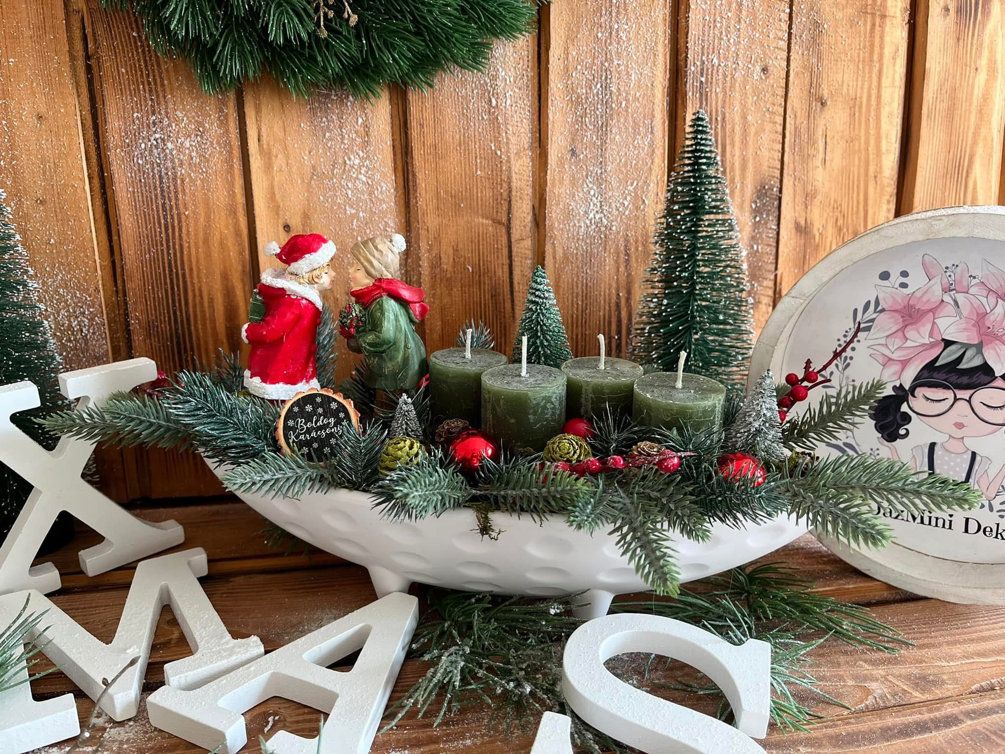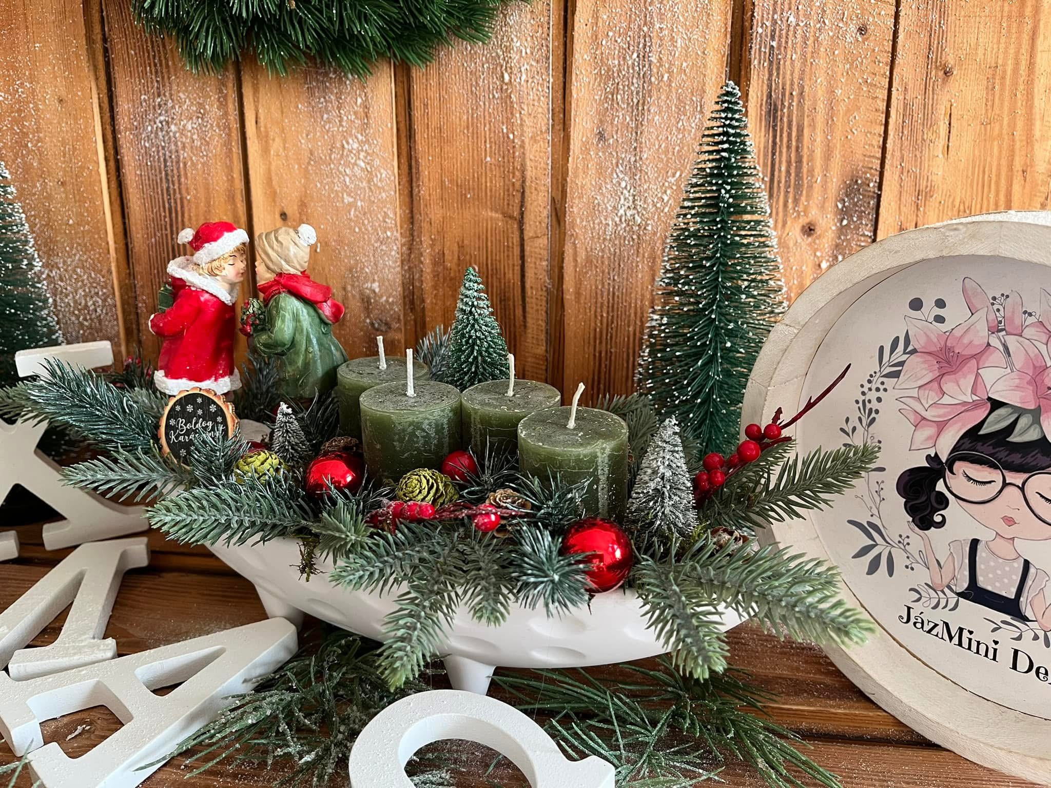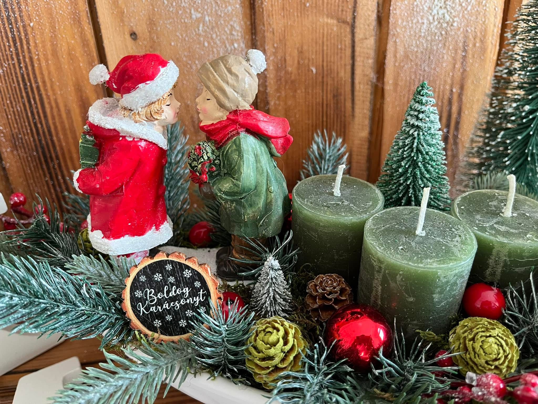 43 cm hosszú,talpas tálra épített adventi dekoráció,melynek a központjában egy klasszikus figurapár található, cserélhető rusztikus gyertyákkal,élethű fenyővel.