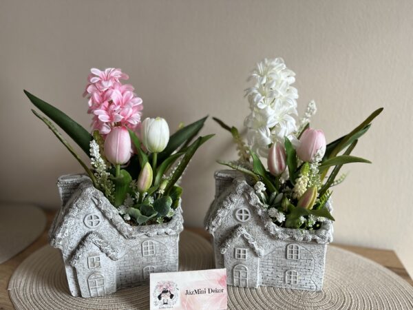17*11 cm-es kő házikóba épített tavaszváró mix.