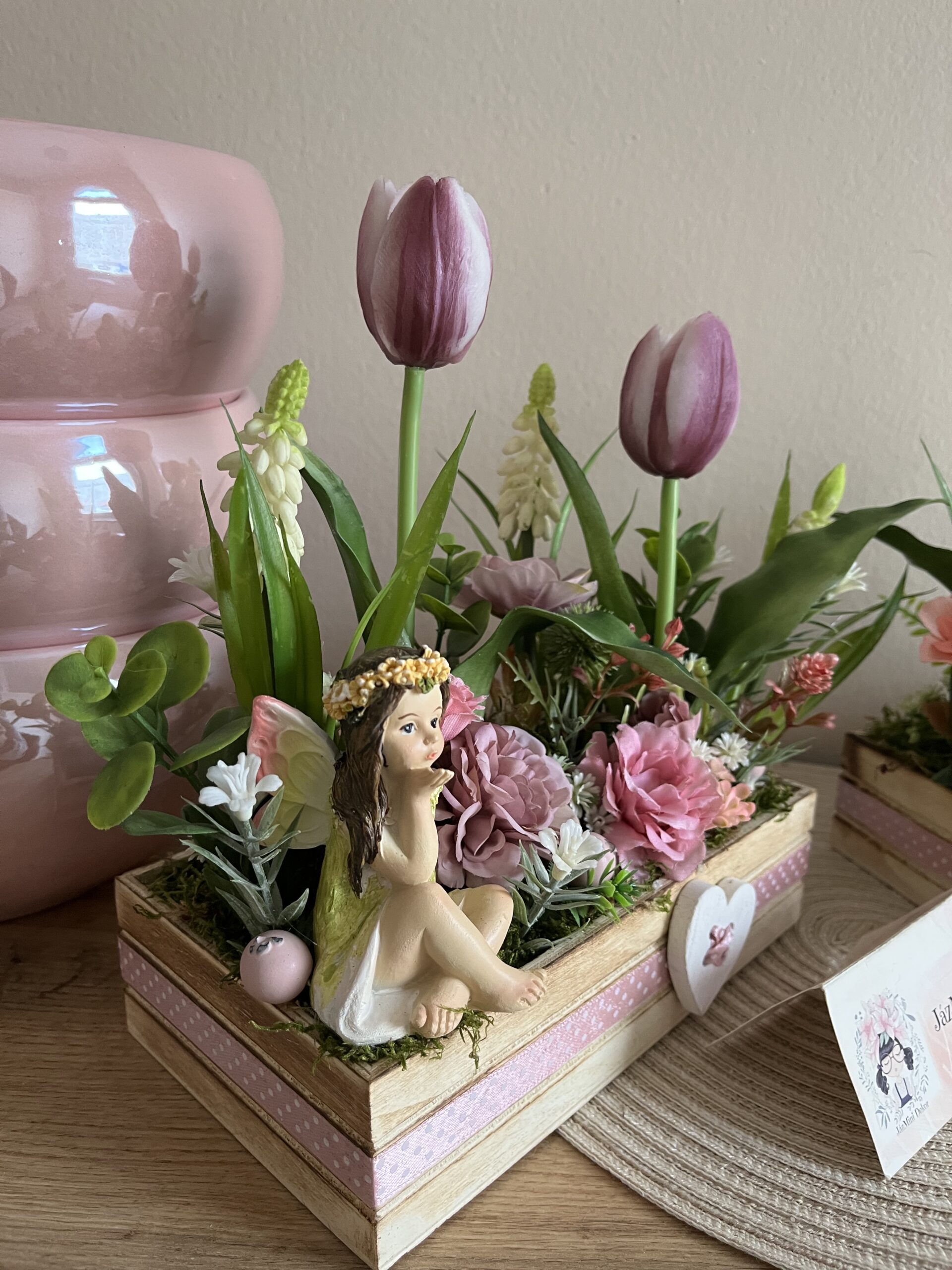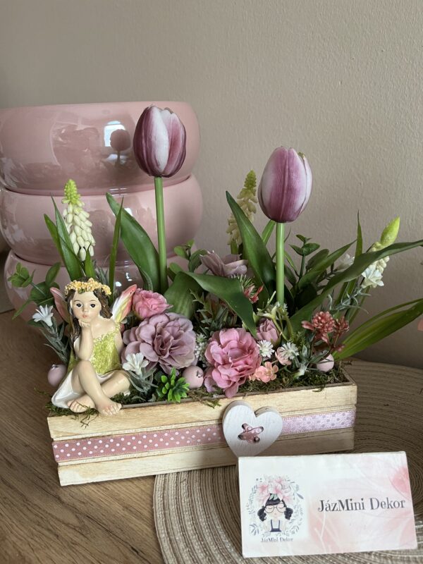 20 cm-es fa dobozba épített tavasztündéres asztali dekoráció,bájos tavasztündérrel,györgyikékkel,élethű tulipánokkal,sok zölddel.