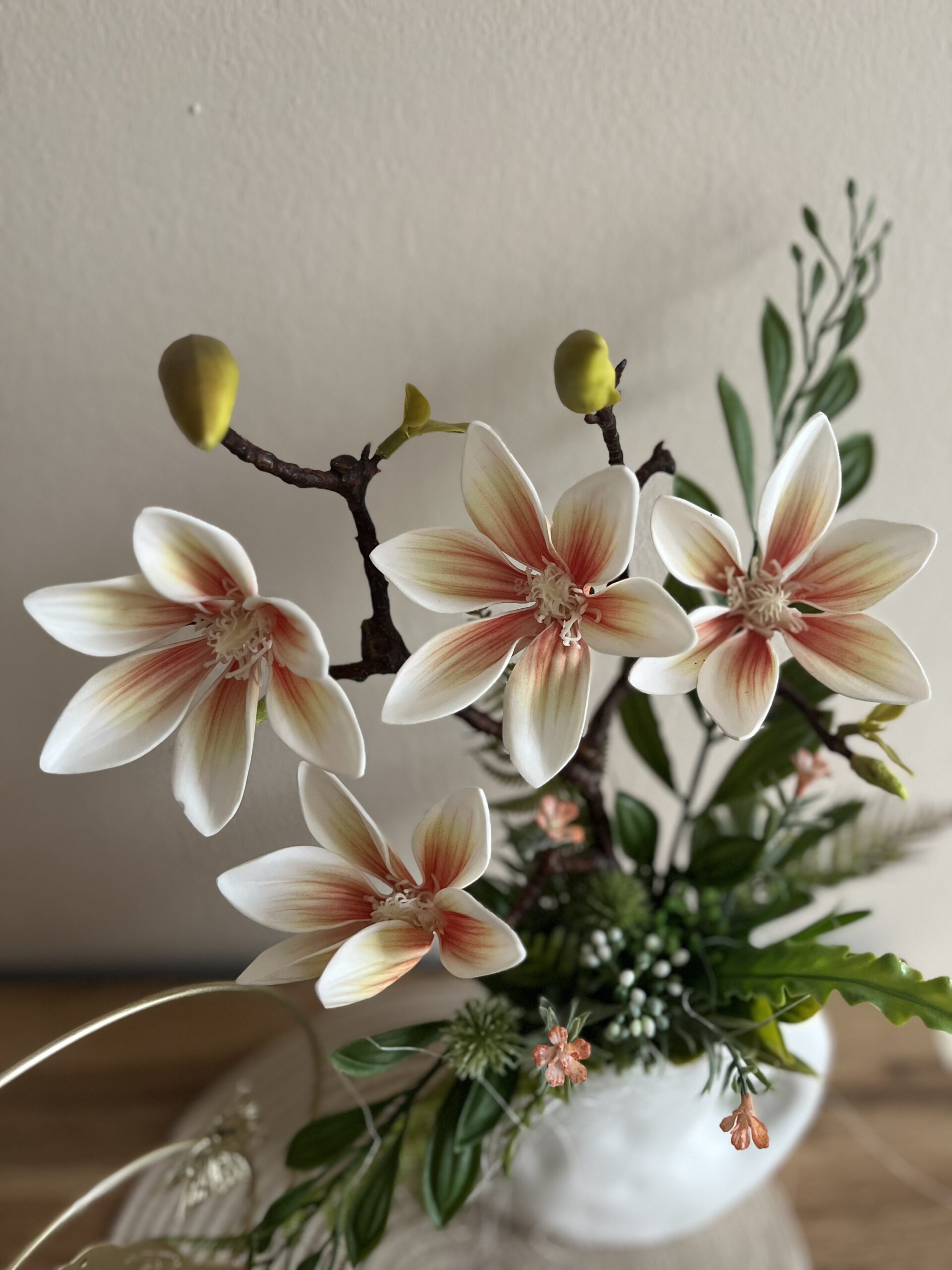 Különleges fehér kerámia vázába épített csillag magnóliás dekoráció.