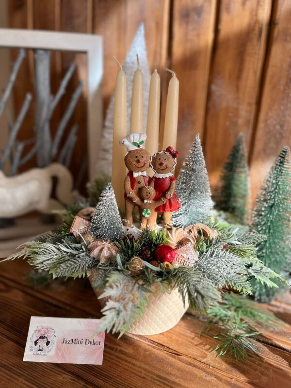 Kerámia tálas adventi dekoráció,melyben egy 3 tagú mézeskalács család a központi elem. Élethű zöldekkel,cserélhető gyertyákkal.