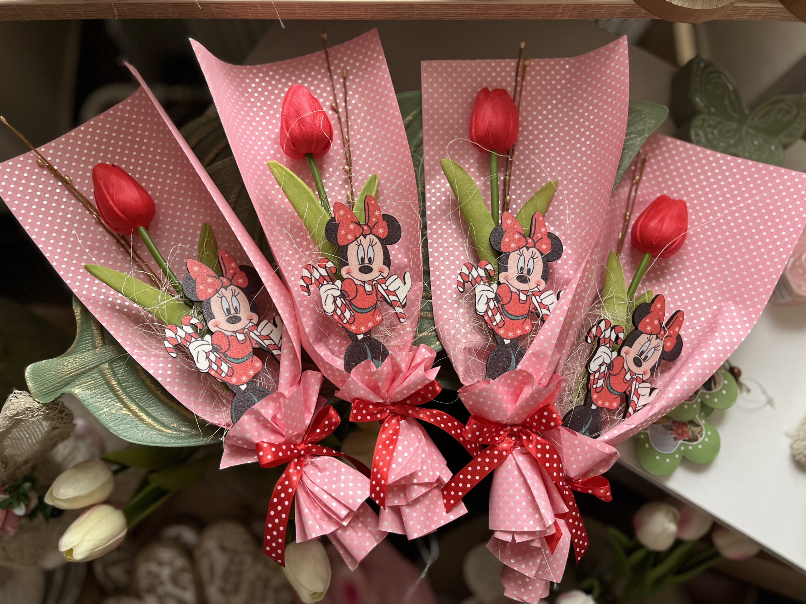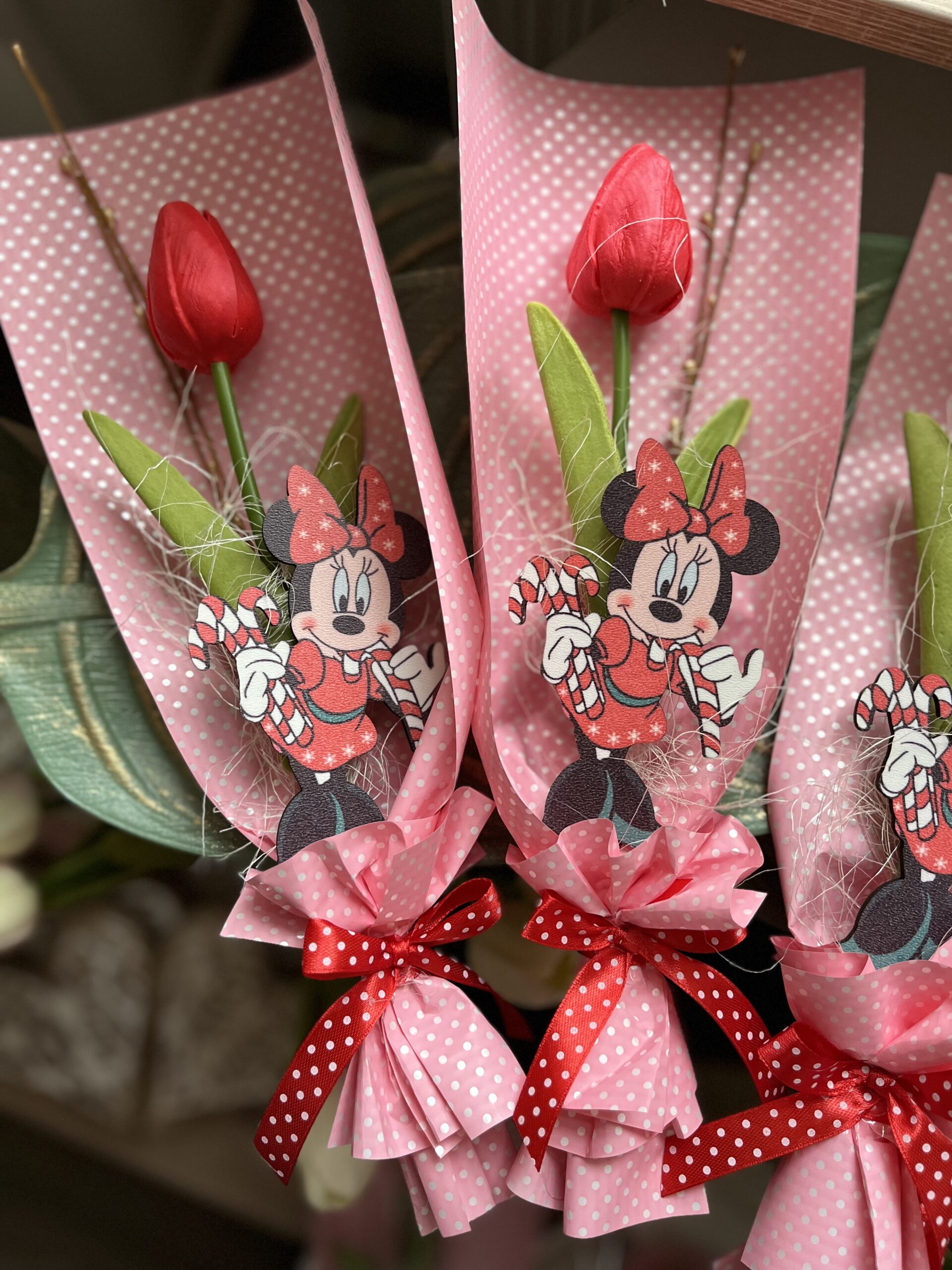 Élethű tulipános,Minnie csokor bármilyen alkalomra.