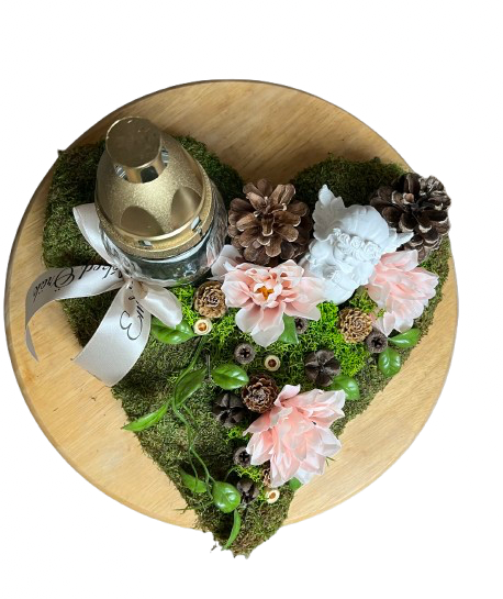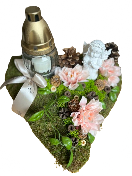 Nagy méretű: 30*30 cm-es moha szív alapos kedvesség kegyeleti megemlékezéshez,angyalkával,mécsessel.