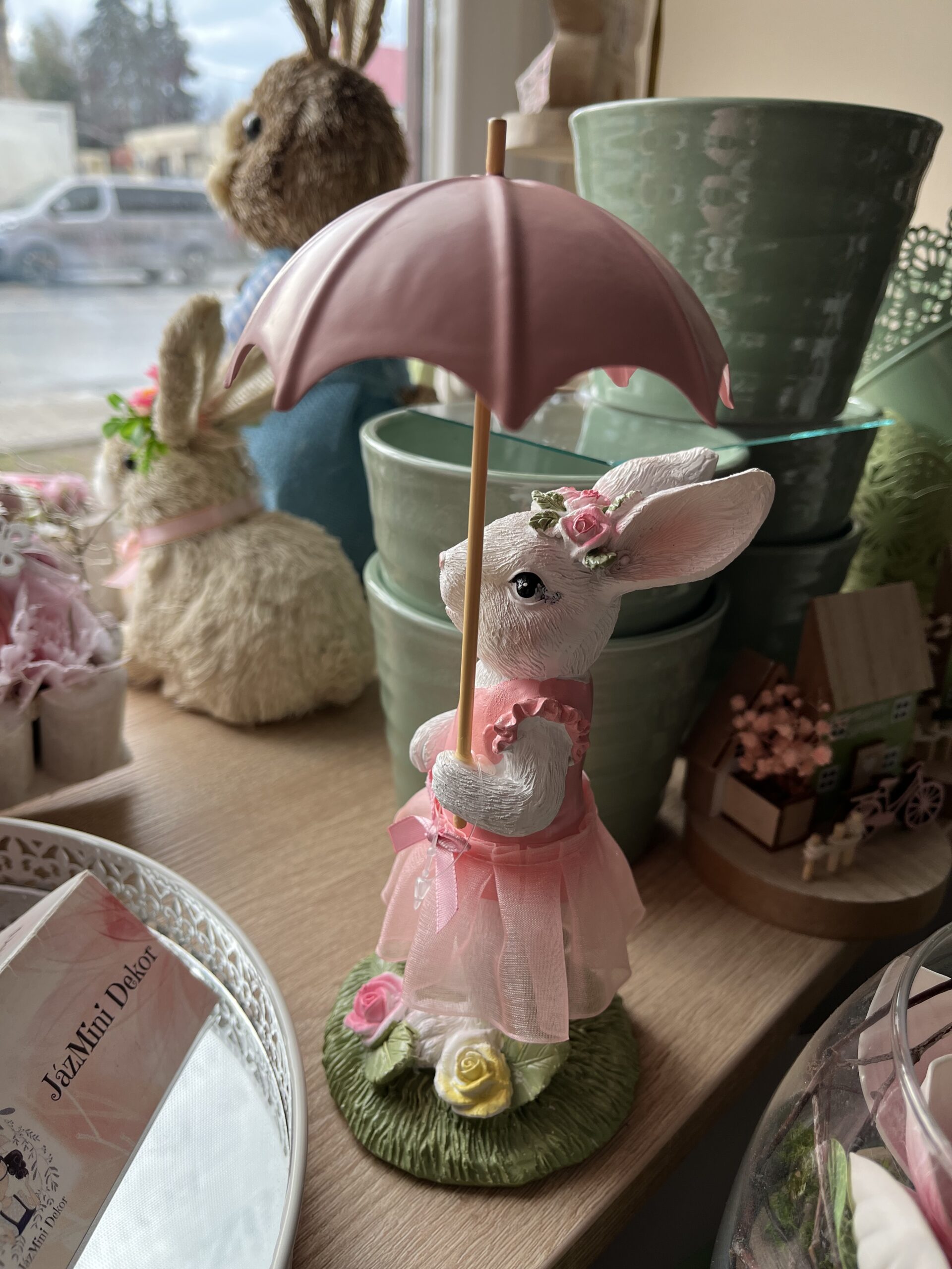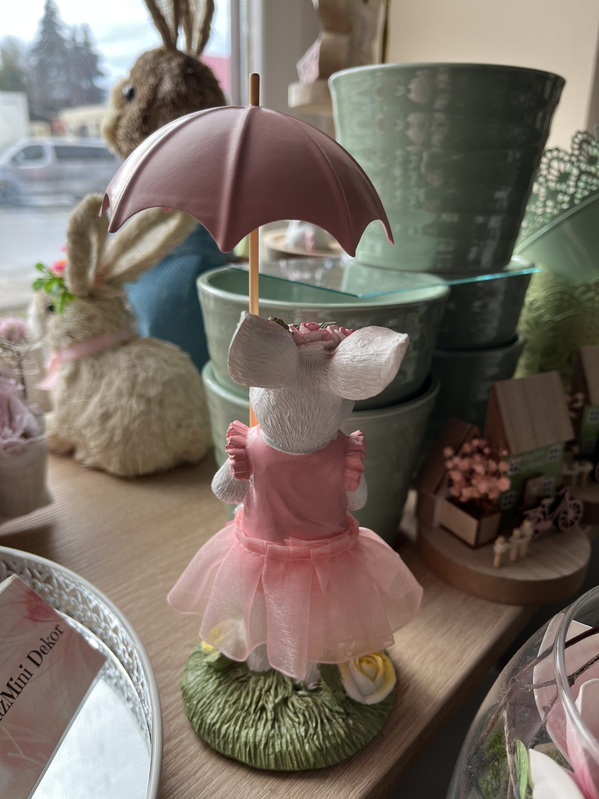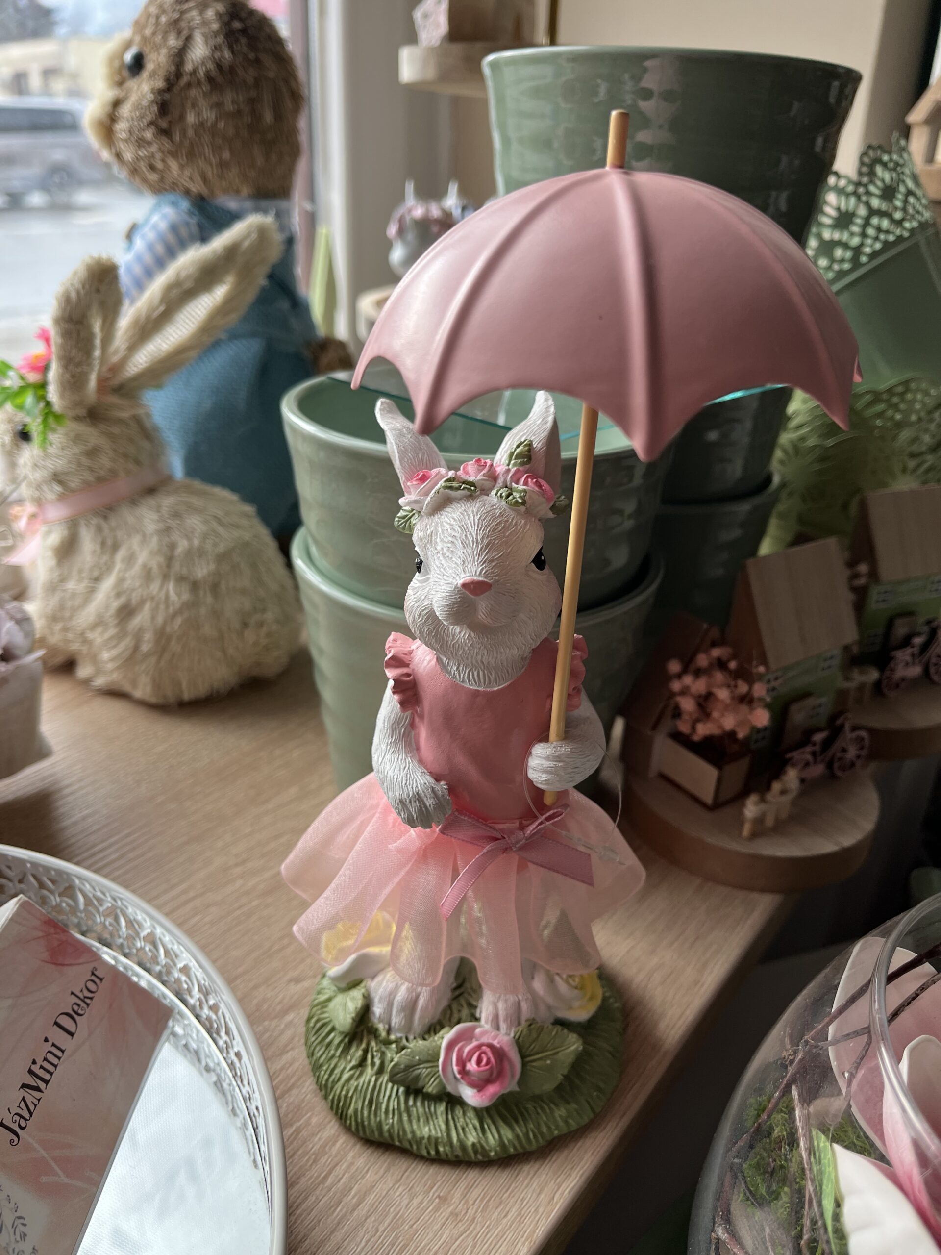 23 cm magas, bájos nyuszi lány,fém esernyővel a kezében.