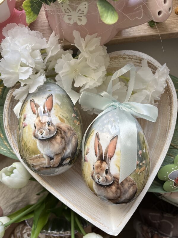 Mesés műanyag akasztható masnis tojás cuki nyuszkóval.