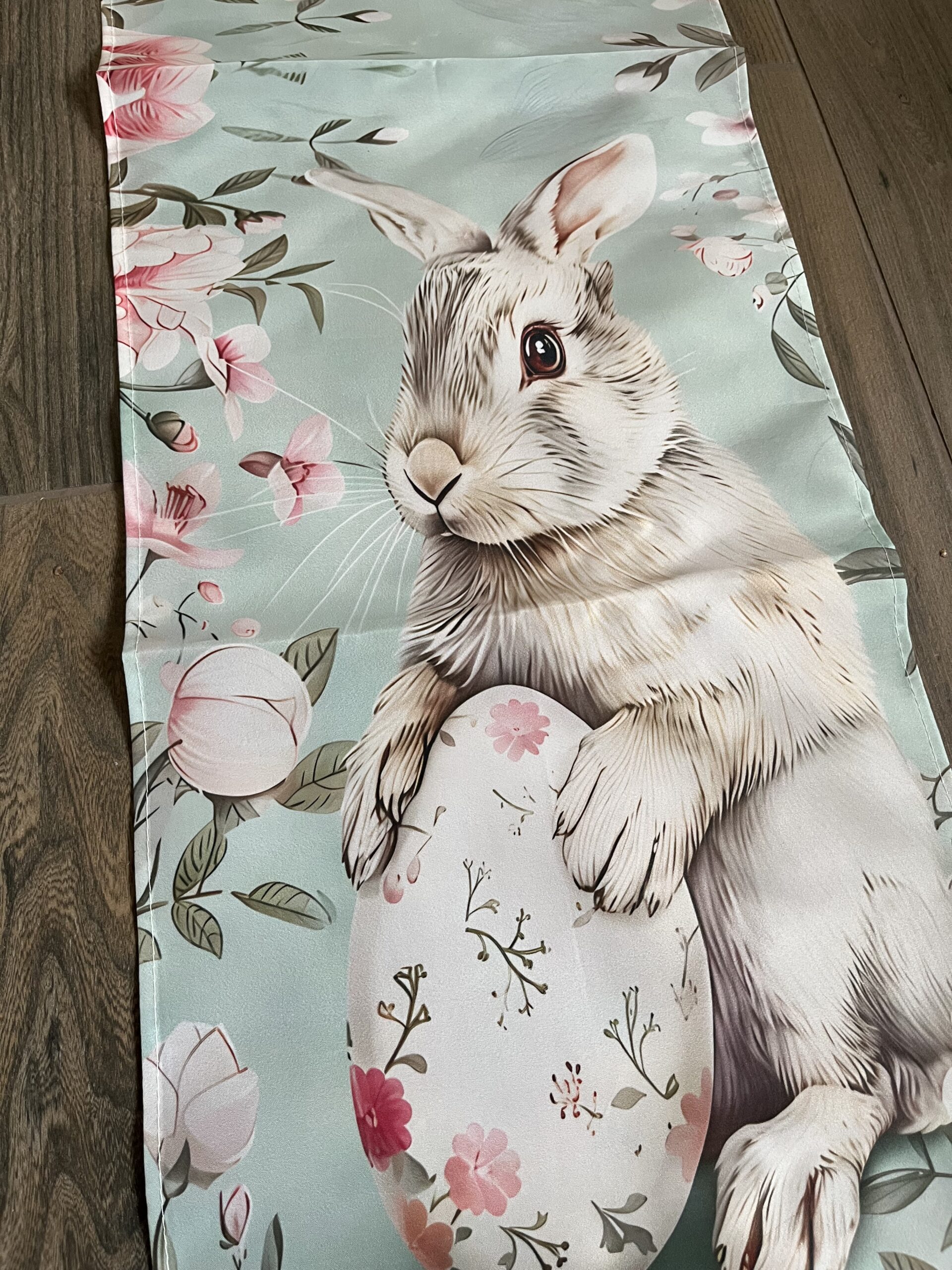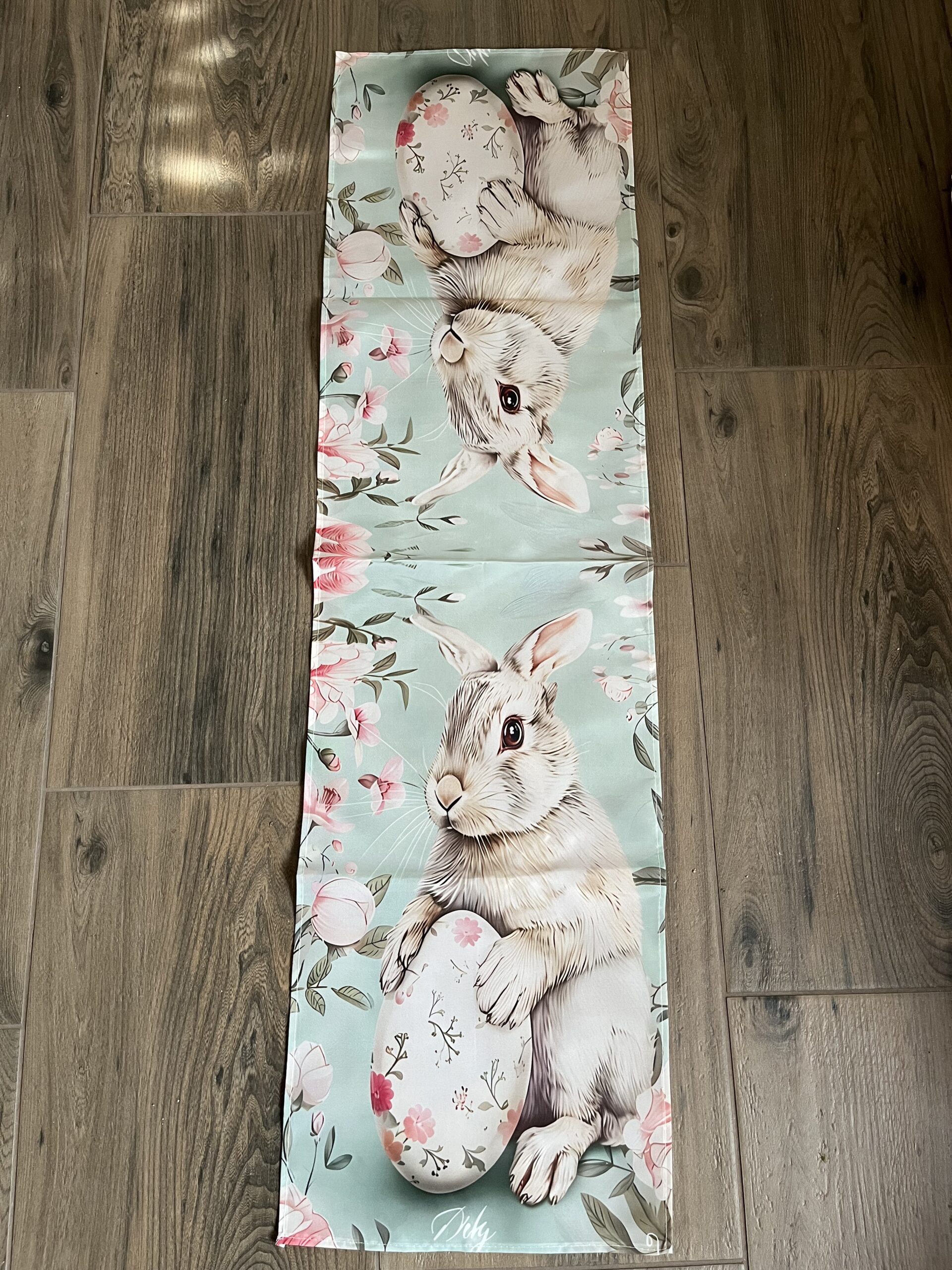 120*33 cm-es poliészter anyagú futó terítő, finom menta színvilággal,cuki nyuszkóval.