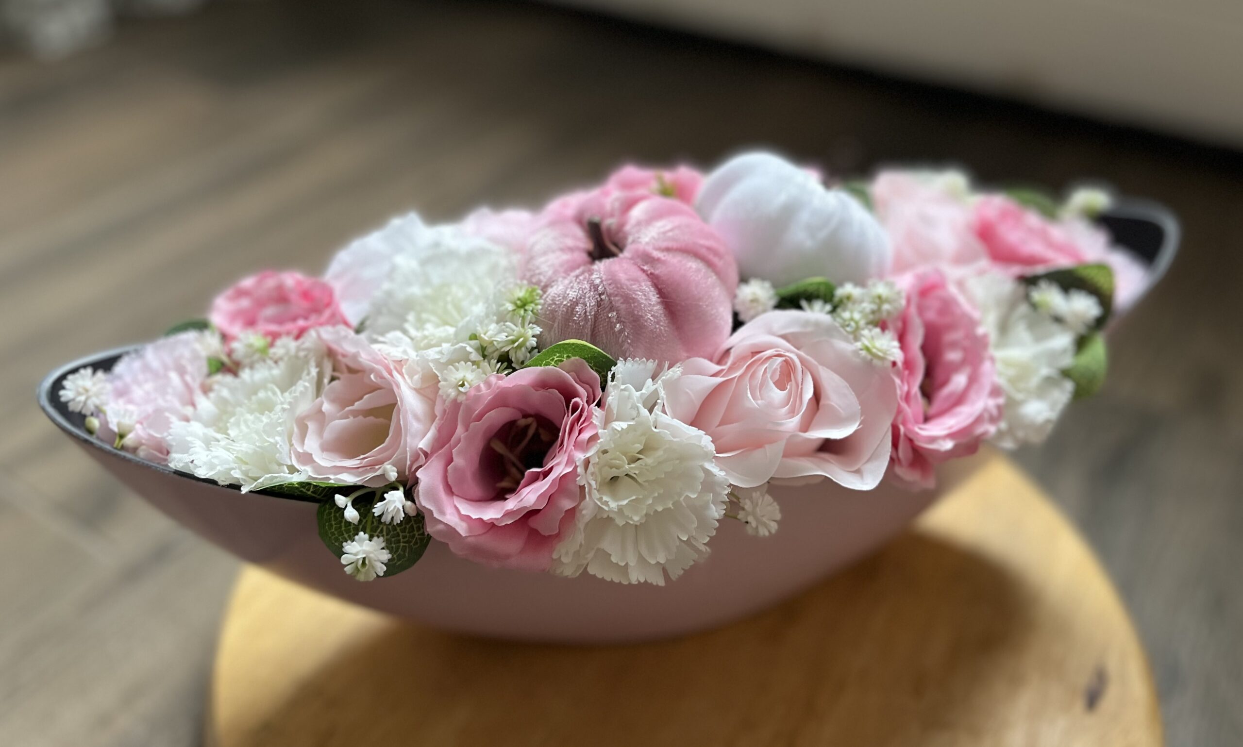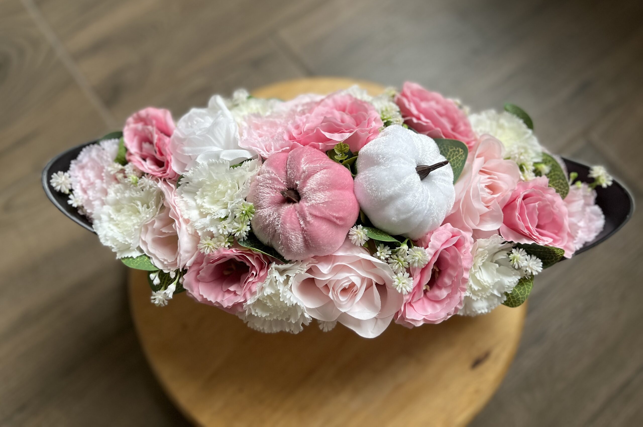 Egy 40 cm hosszú púderrózsaszín csónakba,bársony tökökkel,pasztell virágokkal készített csodás asztali dekoráció,mely azoknak kedvez,akik nem kifejezetten a harsány őszi színeket kedvelik.