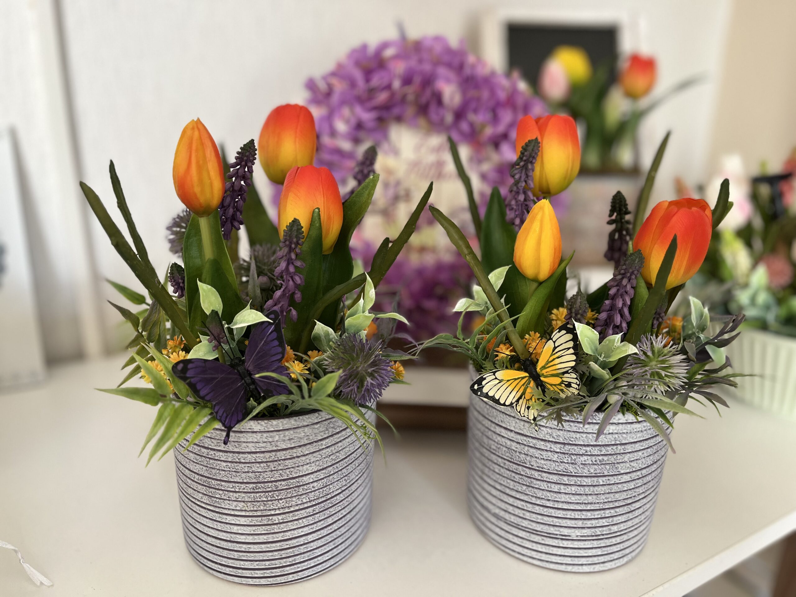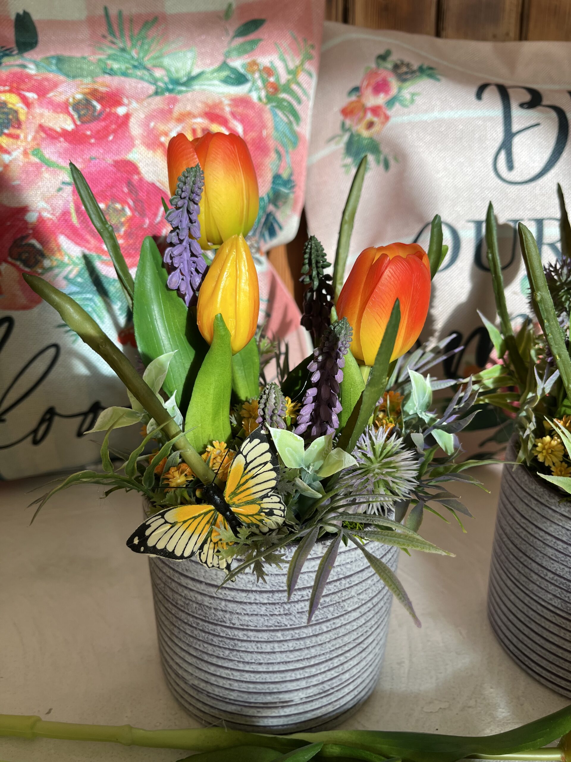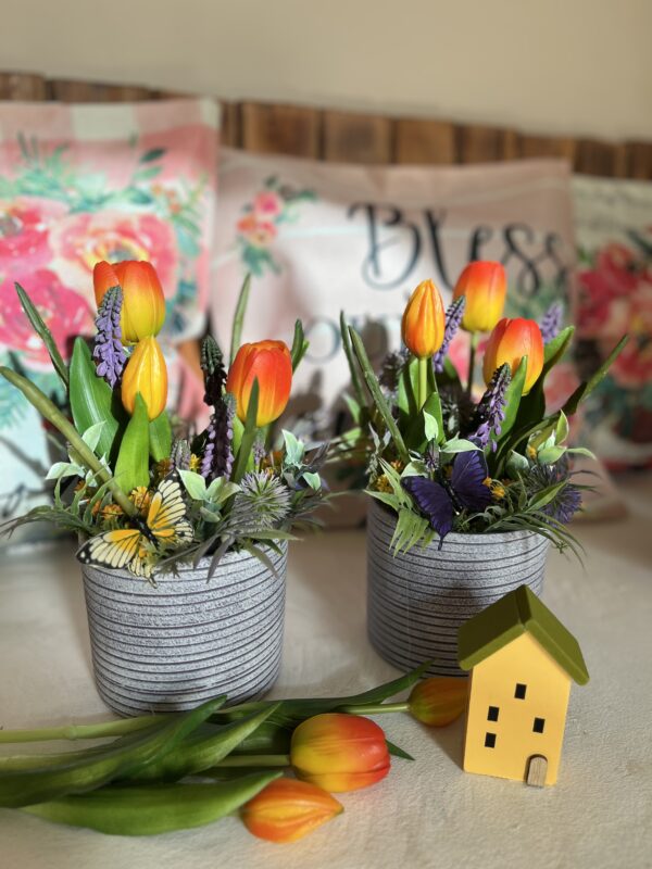 Pillangós,élethű tulipános kaspó-narancs/sárga