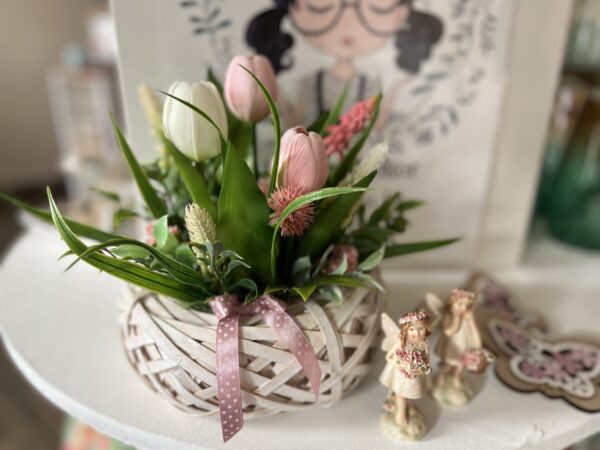 Púder és fehér élethű tulipánokkal készült tavaszváró dekoráció háncs fészekbe építve,melynek átmérője 20 cm, a teljes dekorációé pedig:33 cm.