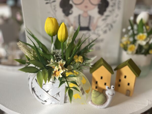 Élethű tulipánokkal készült, 16 cm átmérőjű fészekháncsba épített tavaszváró kedvesség,melynek a teljes átmérője kb.27 cm.