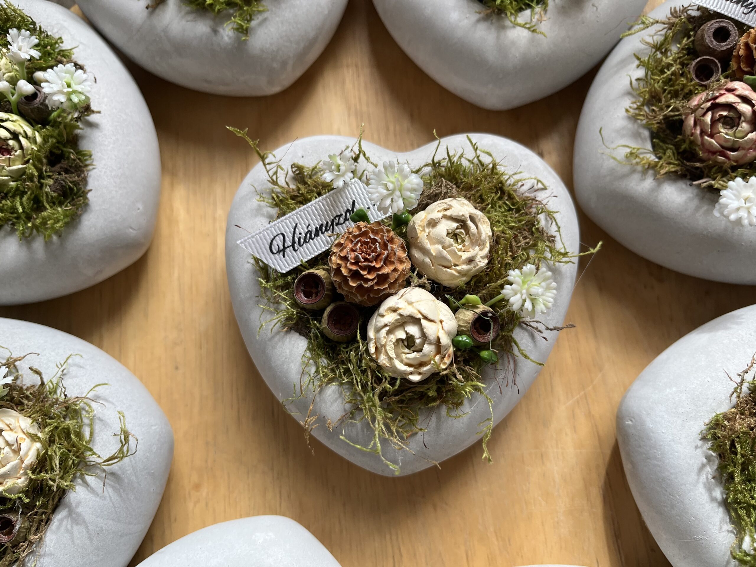 11*11 cm-es szív kőkaspóba épített kedvesség megemlékezéshez.