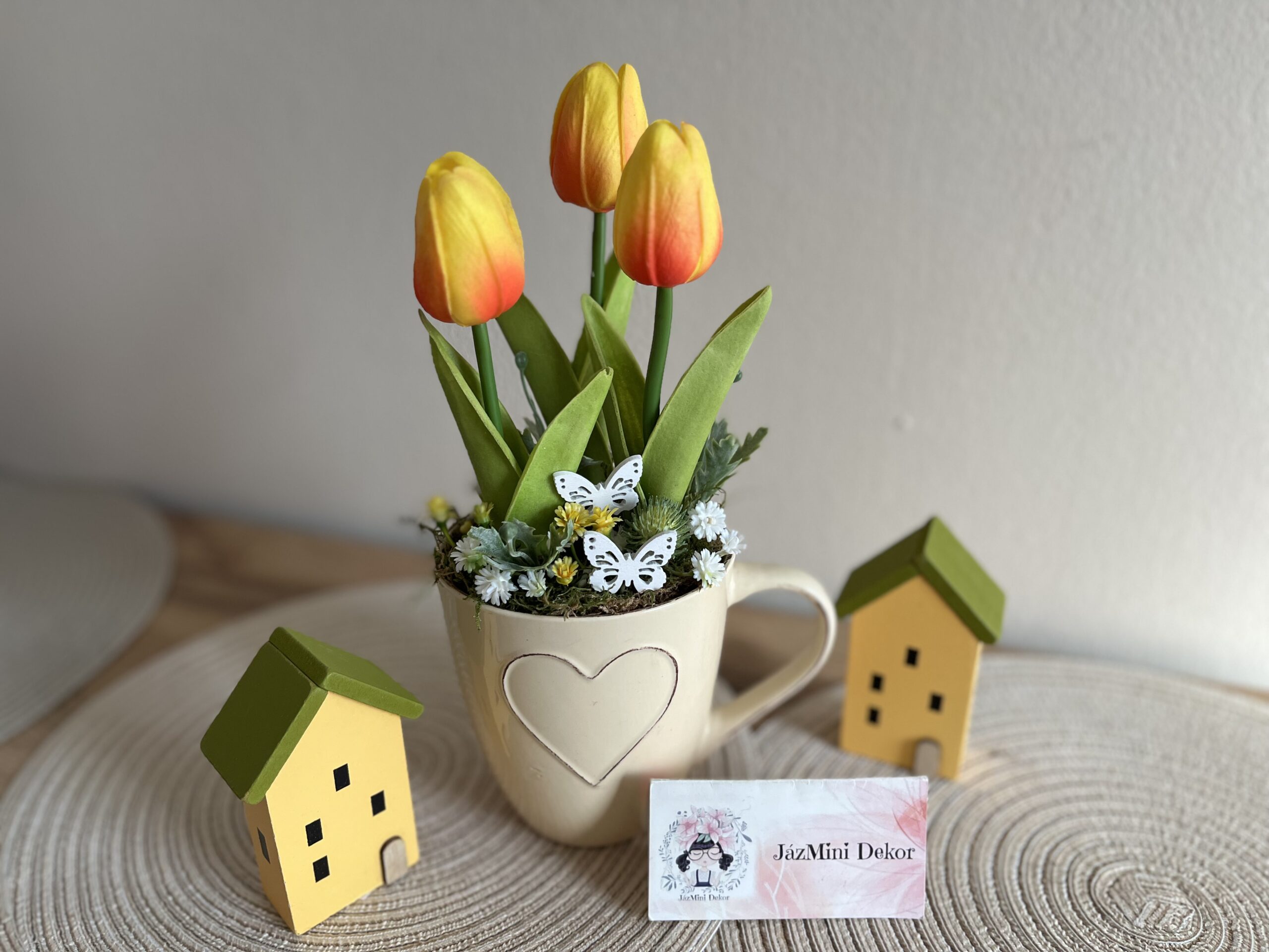 Nagyobb méretű, szivecskés kerámia bögrés dekoráció tulipánokkal és pillangókkal.