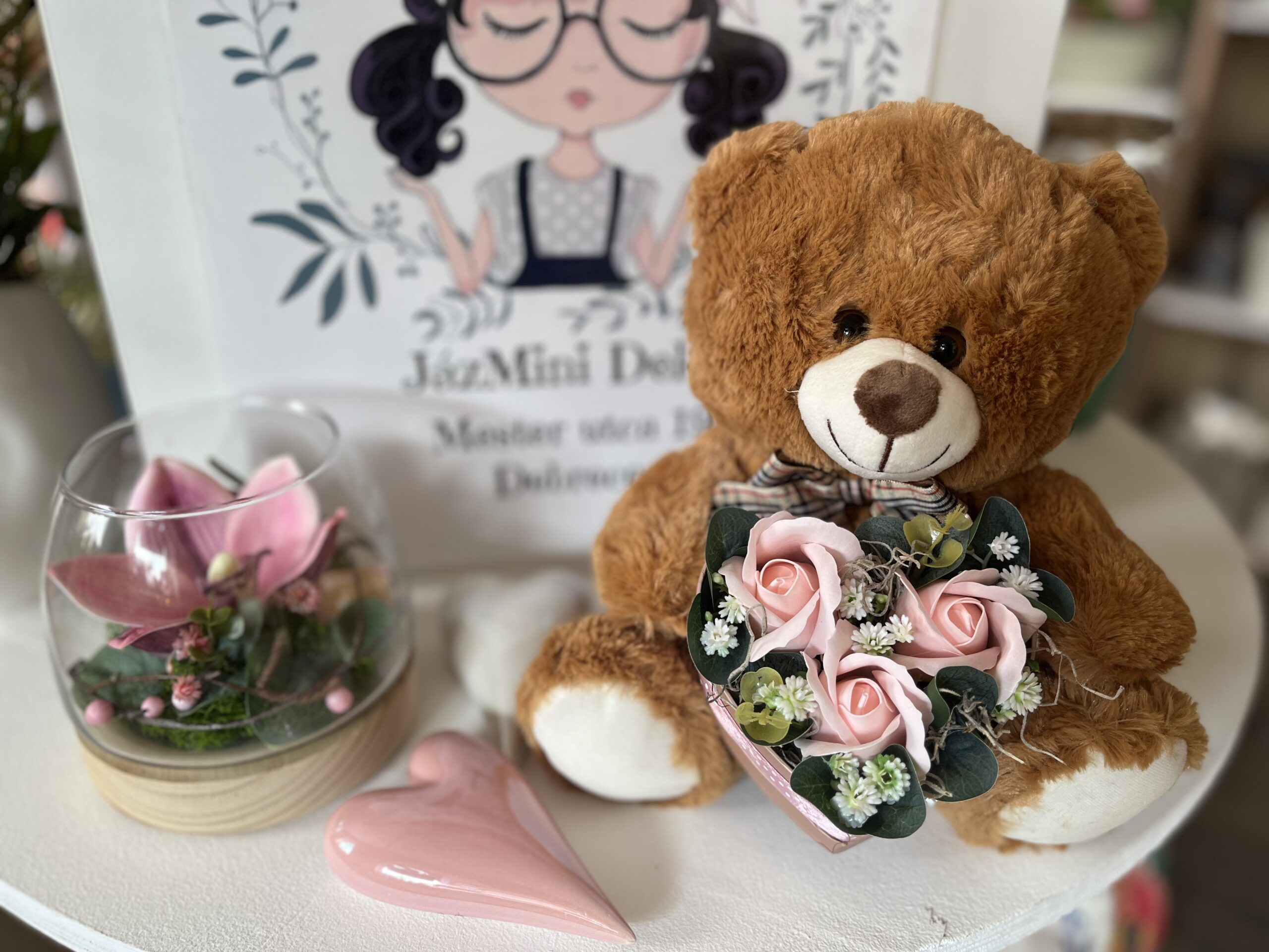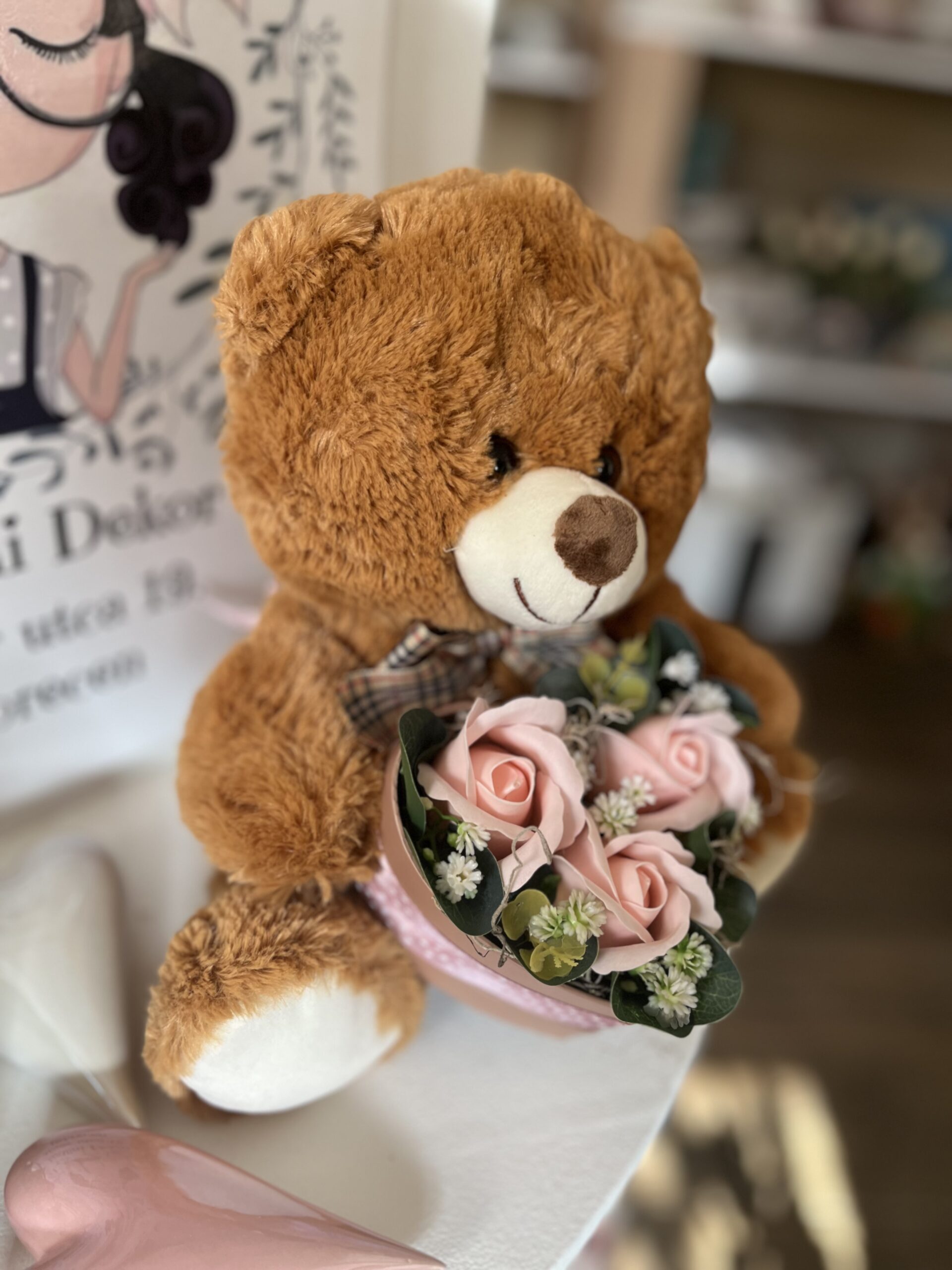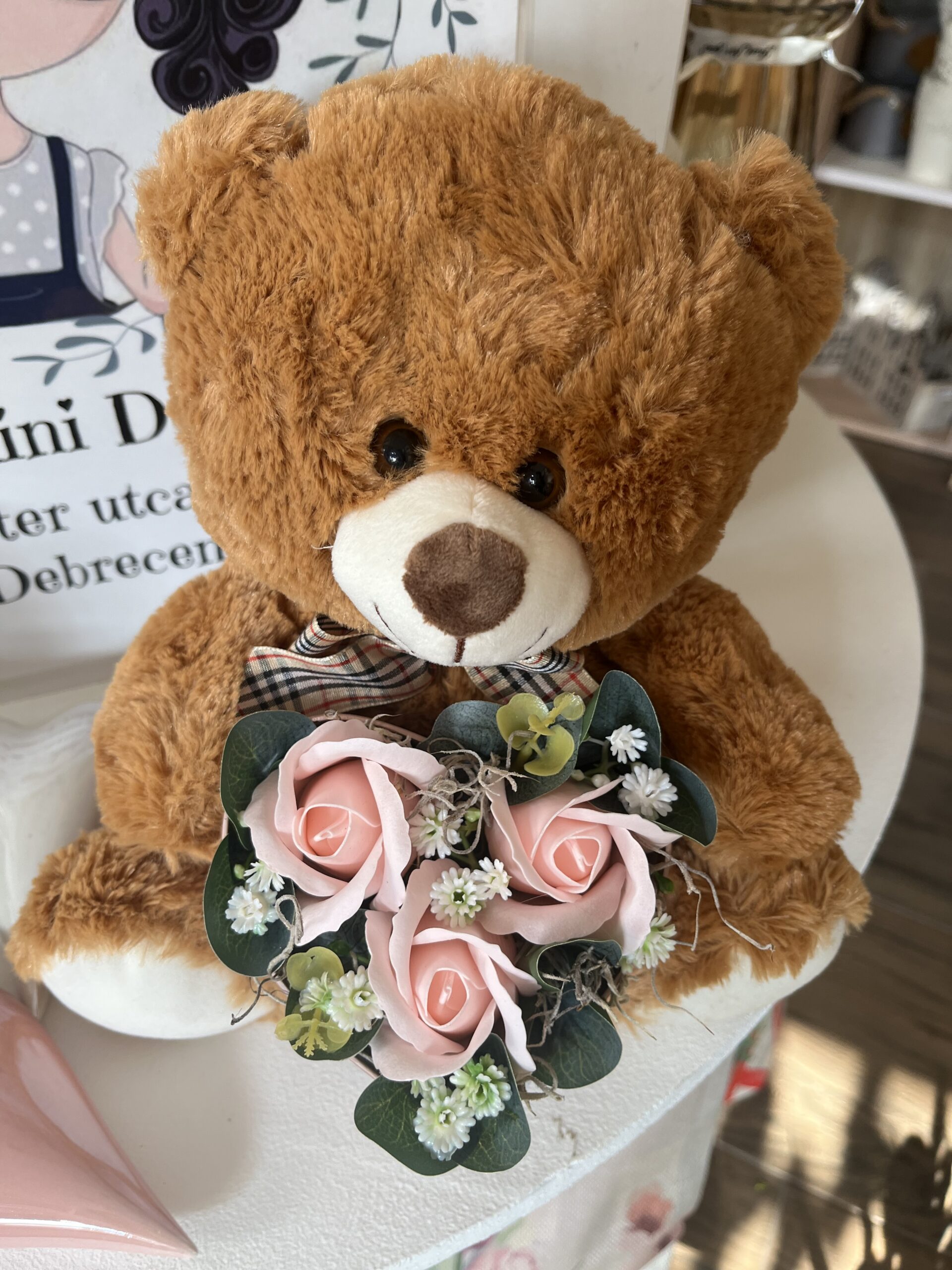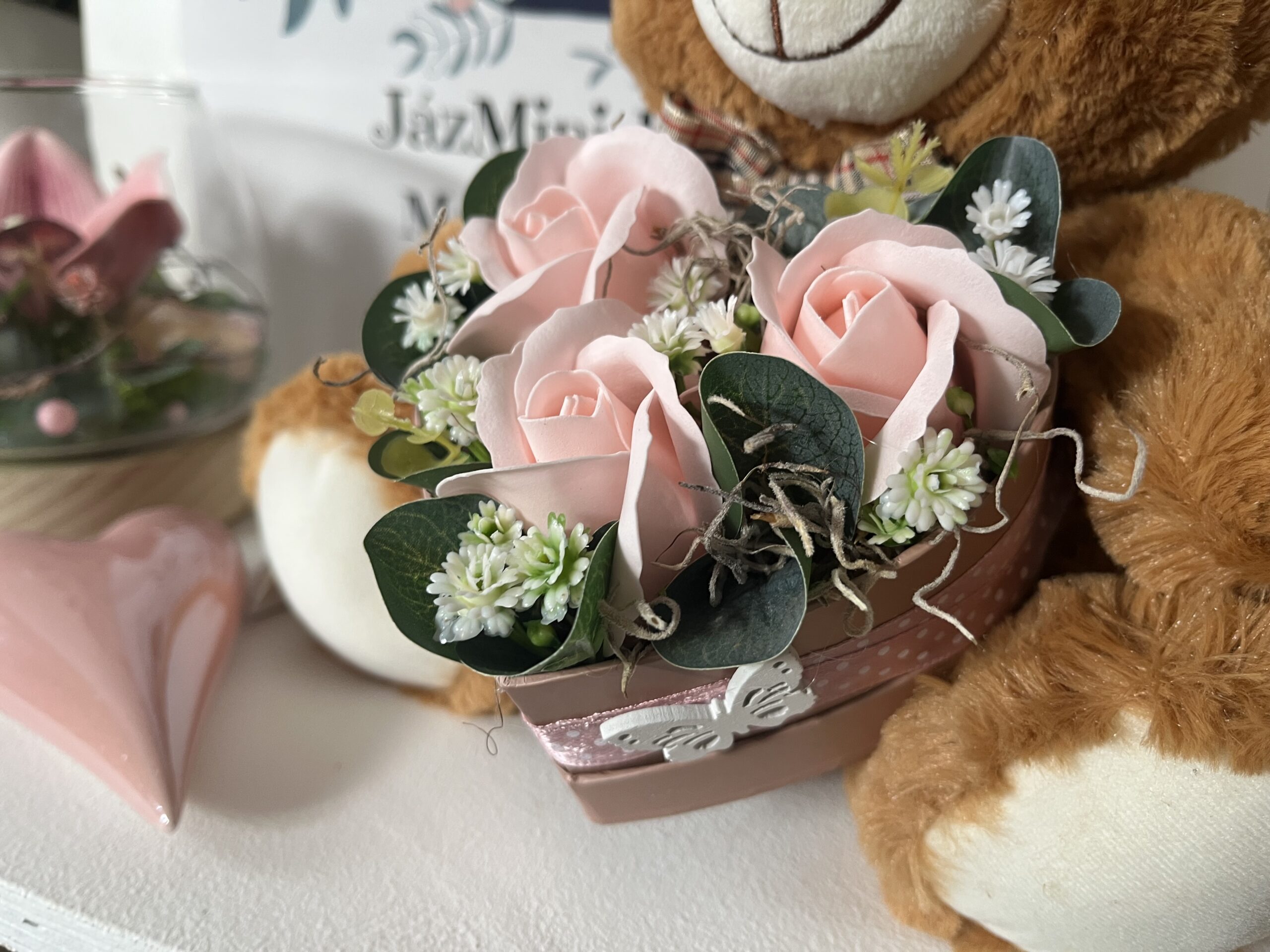 Cuki plüss maci szív alakú szappanrózsa virág dobozzal.