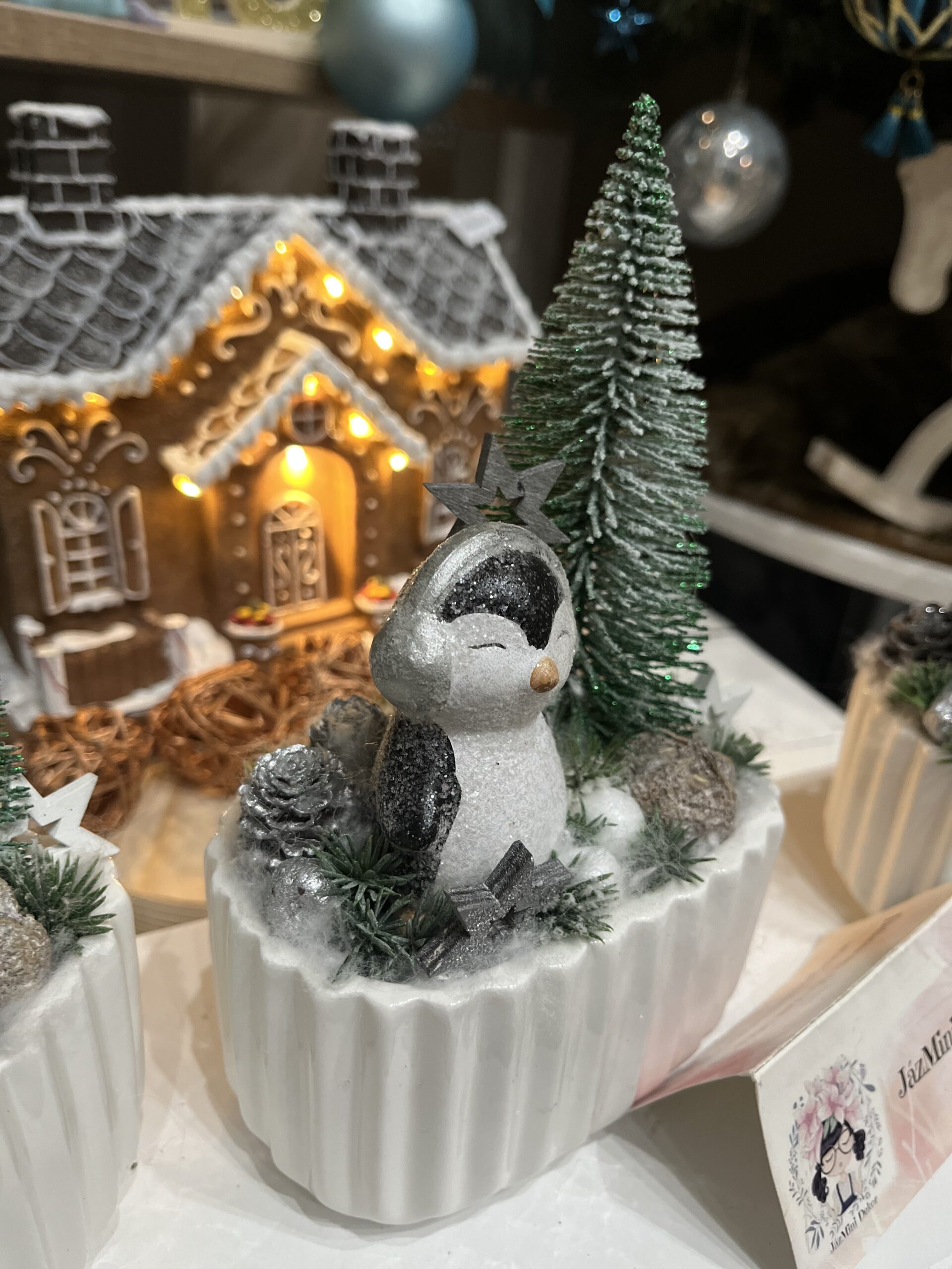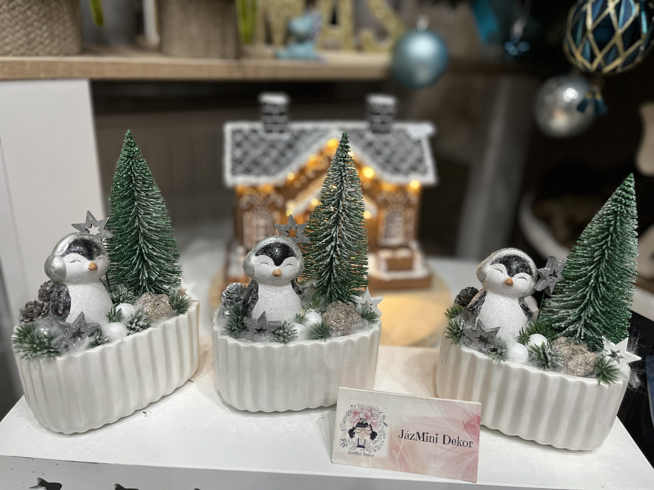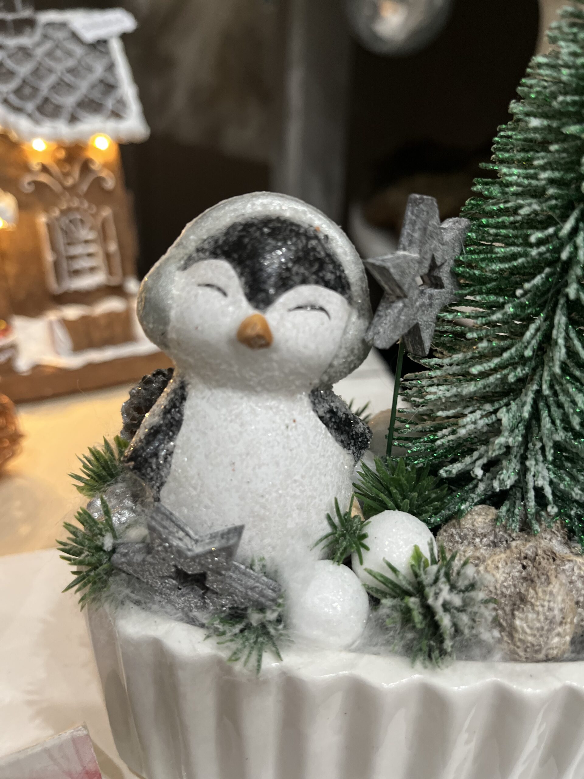 Cuki pingvinekkel készített asztali dekorációk kerámia kaspóban,fenyővel,csillagokkal.