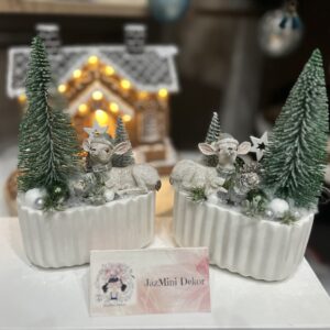 Cuki őzikékkel készített asztali dekorációk kerámia kaspóban,fenyővel,csillagokkal. Minden része maradandó,évekig tartós darab,mely csodás ajándék is lehet. Hazai,kézműves termék.