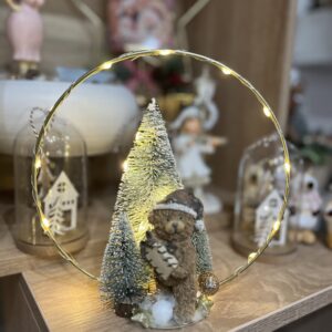 20 cm átmérőjű talpas fém karikás ledes dekoráció,melynek a központi figurája egy bájos maci ajándékkal. Melegfényű leddel,3 pozicióban kapcsolható. Hazai kézműves termék.
