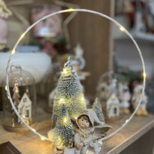 25 cm átmérőjű talpas fém karikás ledes dekoráció,melynek a központi figurája egy bájos tündér lány. Melegfényű leddel,3 pozicióban kapcsolható. Hazai kézműves termék.